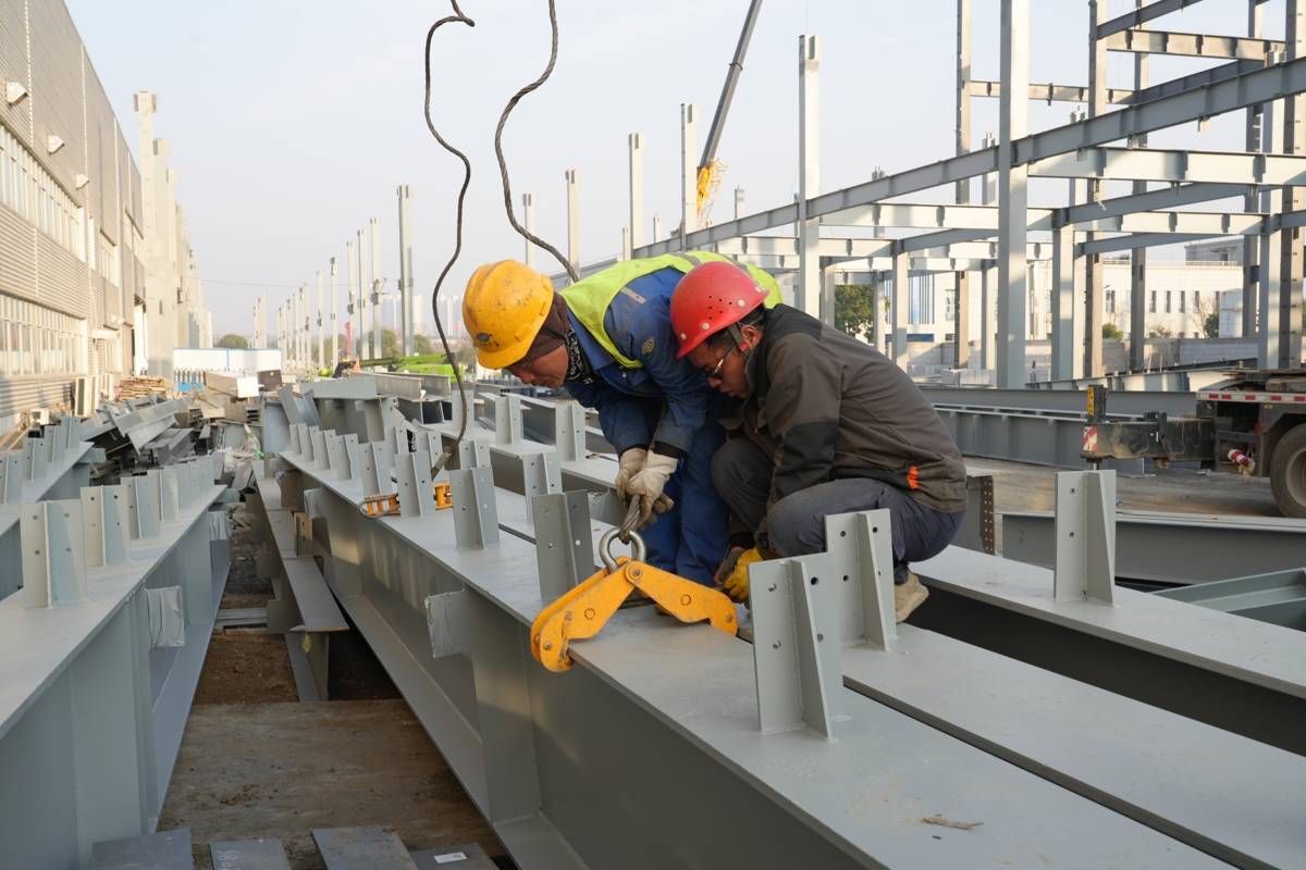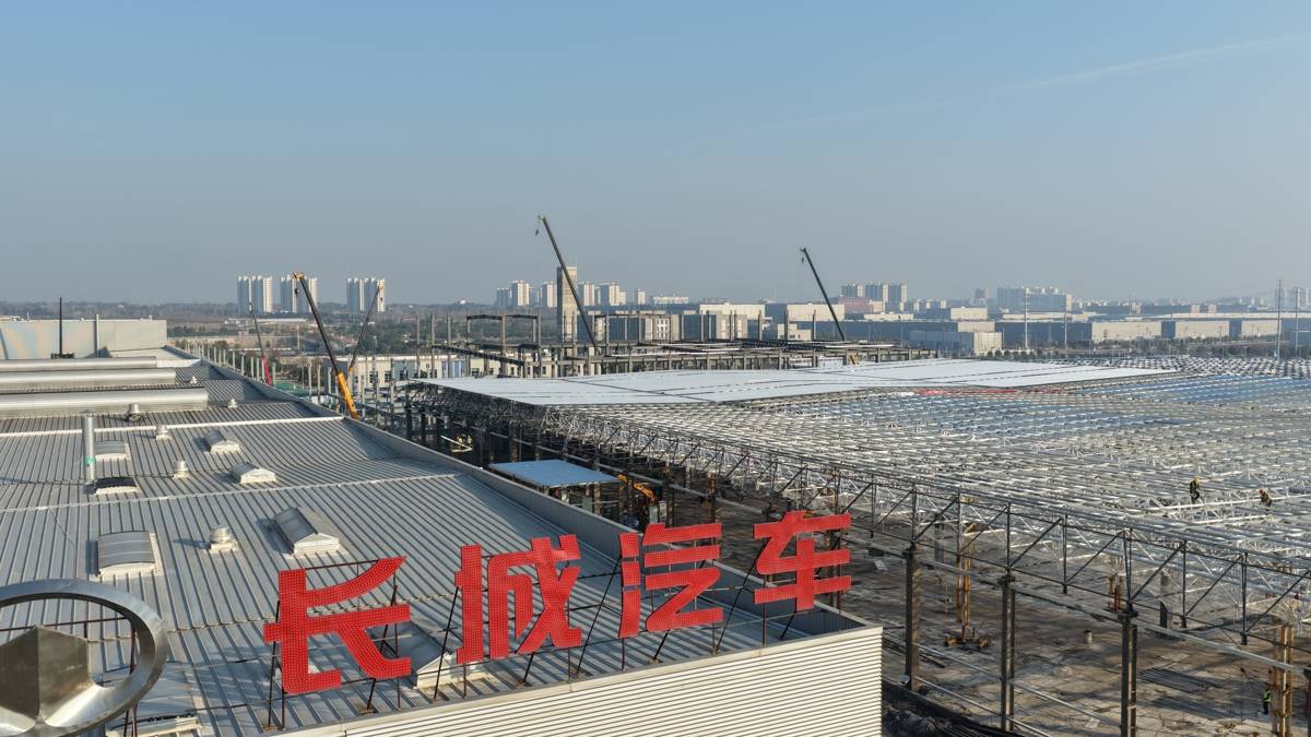 目前,项目焊装车间1.6万平方米的网架已完成顶升,施工人员正在铺设屋面瓦,同步进行管线和设备安装施工;1.3万平方米的涂装车间正在进行钢柱钢梁吊装、地坪浇筑、墙体砌筑施工;1万平方米的冲压车间主体结构已完成,正在进行管线穿装及屋面保温防水施工;0.4万平方米的联合动力站房钢结构工程即将完成,正在进行设施安装。