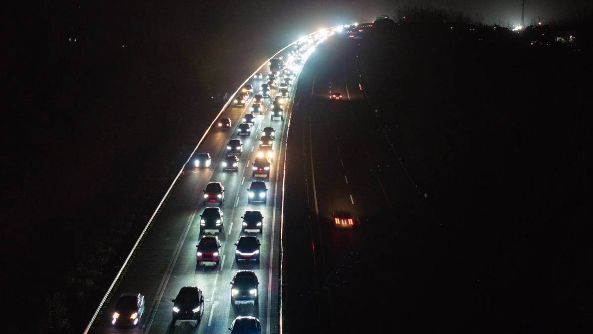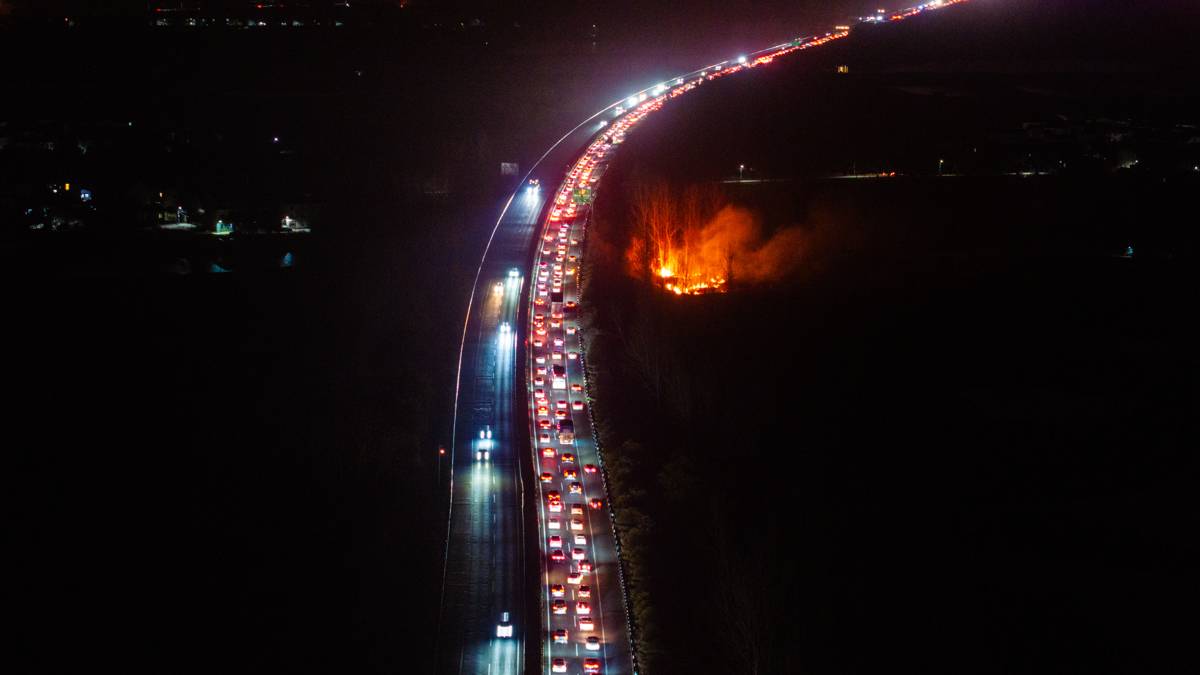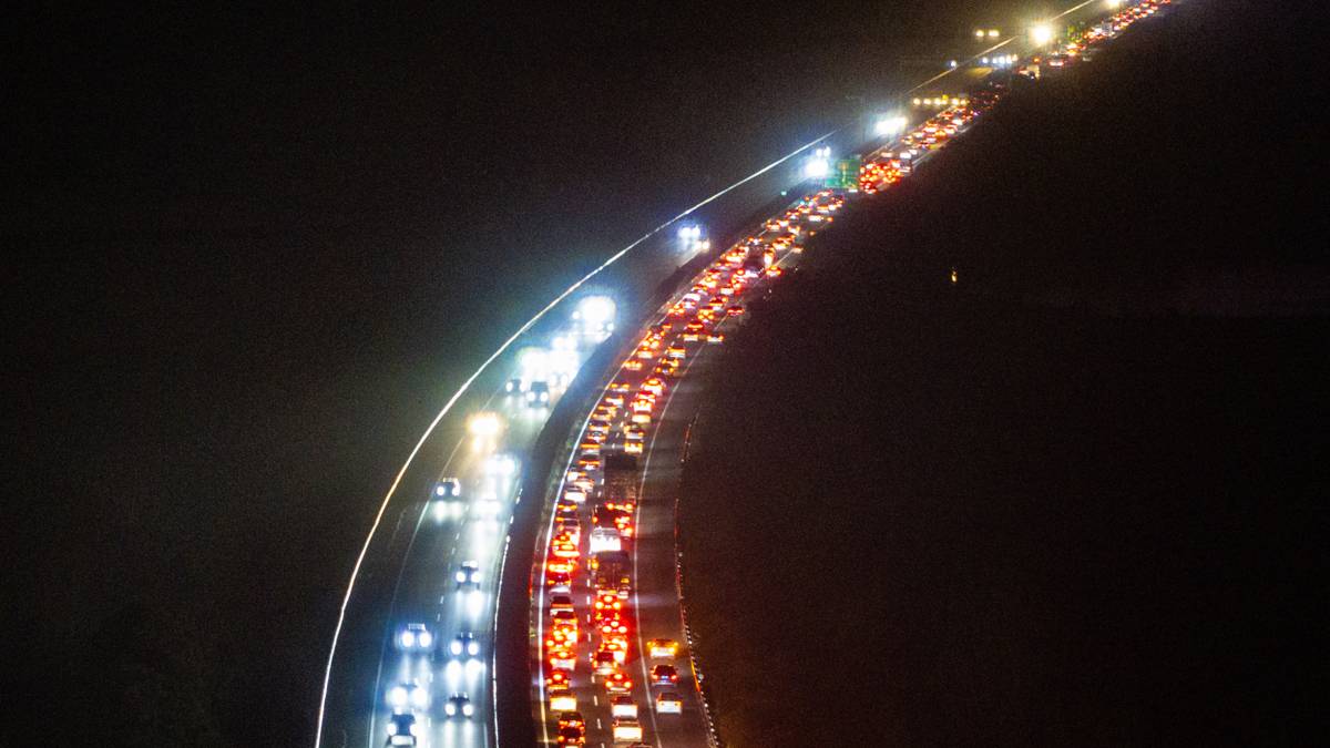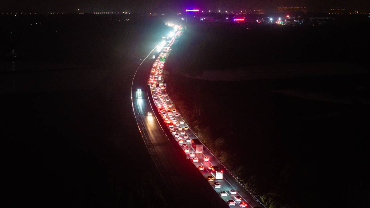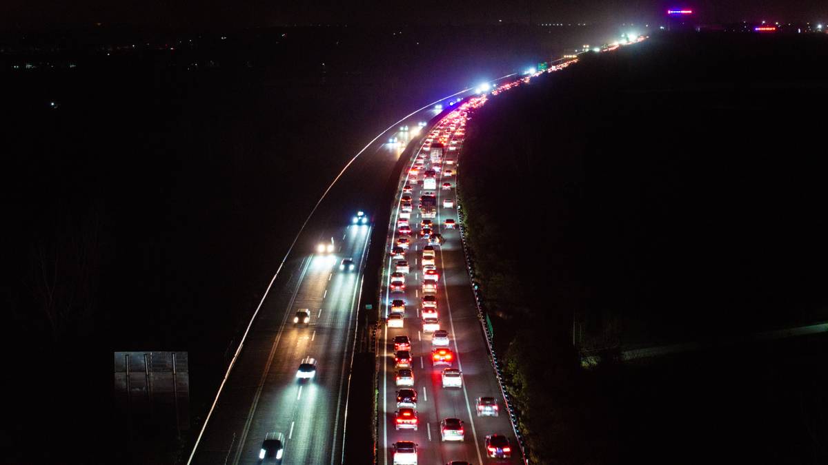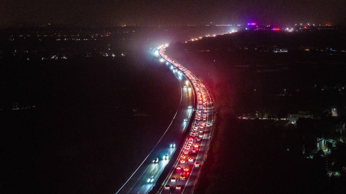 2026年2月22日,大年初六,春运公路返程客流进入高峰,在武汉市黄陂区福银高速福州往银川方向祁家湾路段,大批踏上返程的车辆缓慢行驶排队进入武汉。(湖北日报全媒记者 何宇欣 摄)