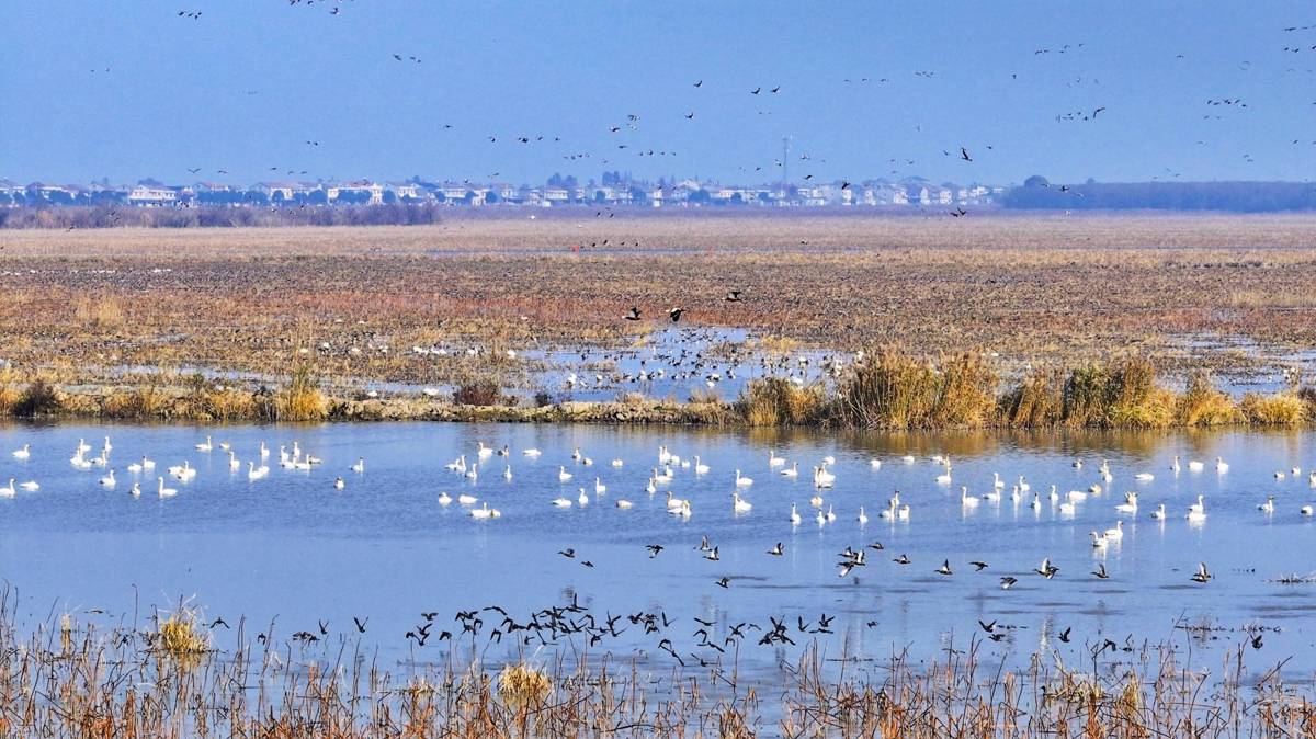 洪湖湿地保护区内,成群候鸟或觅食休憩、或展翅飞翔。(湖北日报全媒记者张灿 摄)