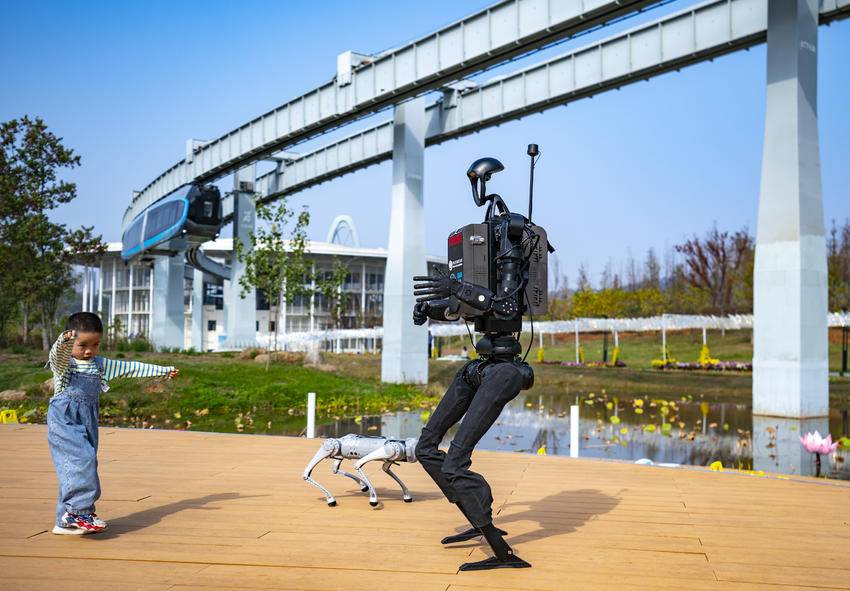 武汉东湖高新区空轨高新大道站,在光谷装上“智慧大脑”的人形机器人,与小朋友在生态大走廊斗舞。 (湖北日报全媒记者 魏铼 摄)