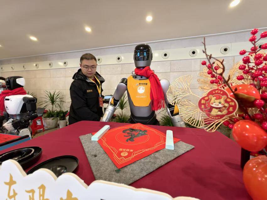 天问人形机器人在新春第一会现场写对联。(湖北日报全媒记者 陈少哲 摄)