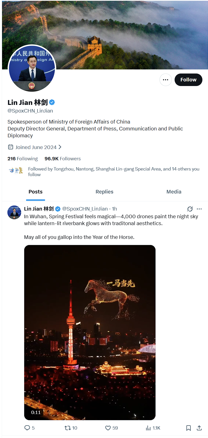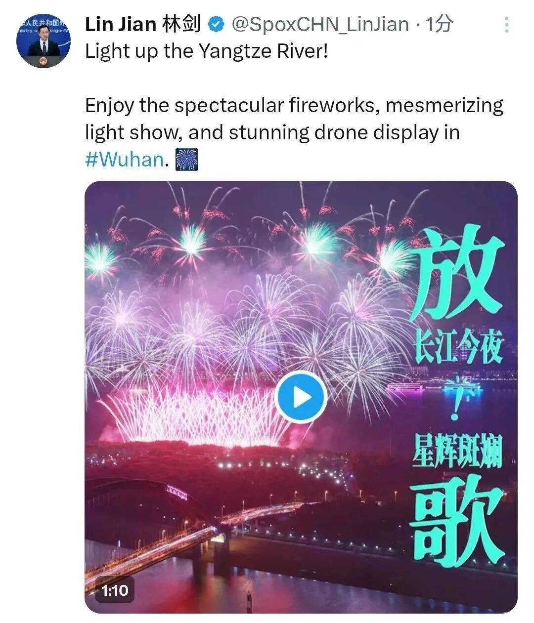 湖北日报讯(记者朱惠、通讯员刘丽娇)2月23日下午,中国外交部发言人林剑在海外社交媒体平台X(原推特)上,发布了武汉龟山电视塔灯光秀和晴川灯会的视频。