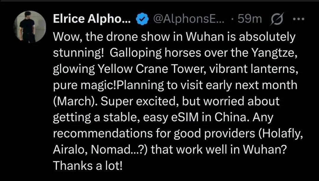 林剑在推文中写道:“在武汉过春节神奇非凡——4000架无人机亮相璀璨夜空,江滩两岸流光溢彩,点燃传统之美。愿大家在新的一年里,驰骋万里,马到成功。”