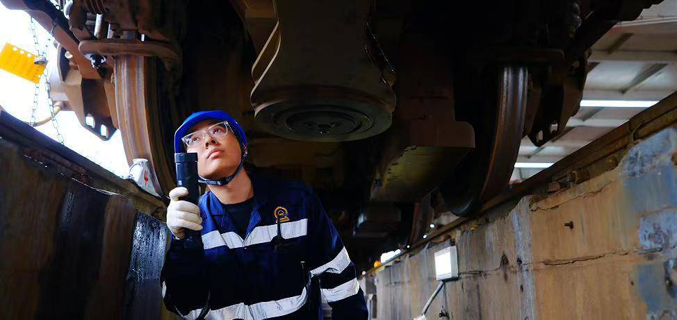 “先查走行部,再检制动系统!所有线路一丝一毫都不能松动,细节上绝对不能有半点马虎!”党员职工江南南手持检车锤,语气坚定。话音未落,他就俯身钻进狭小的机车底部,专注地检查转向架、轮对、牵引装置等关键部位。他一边走一边敲,凭借多年积累的经验,能从敲击声的细微差异中,精准判断螺栓有没有松动、部件有没有裂纹。这些部件就像火车的“钢铁双腿”,直接关系到行车安全,每一次敲击都是对旅客安全的郑重承诺。