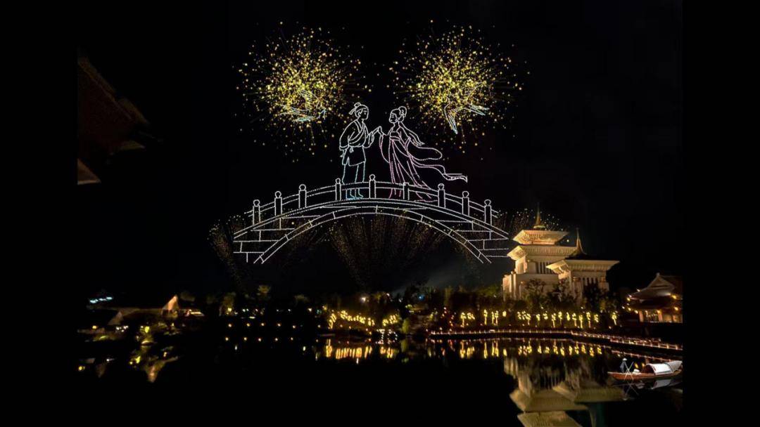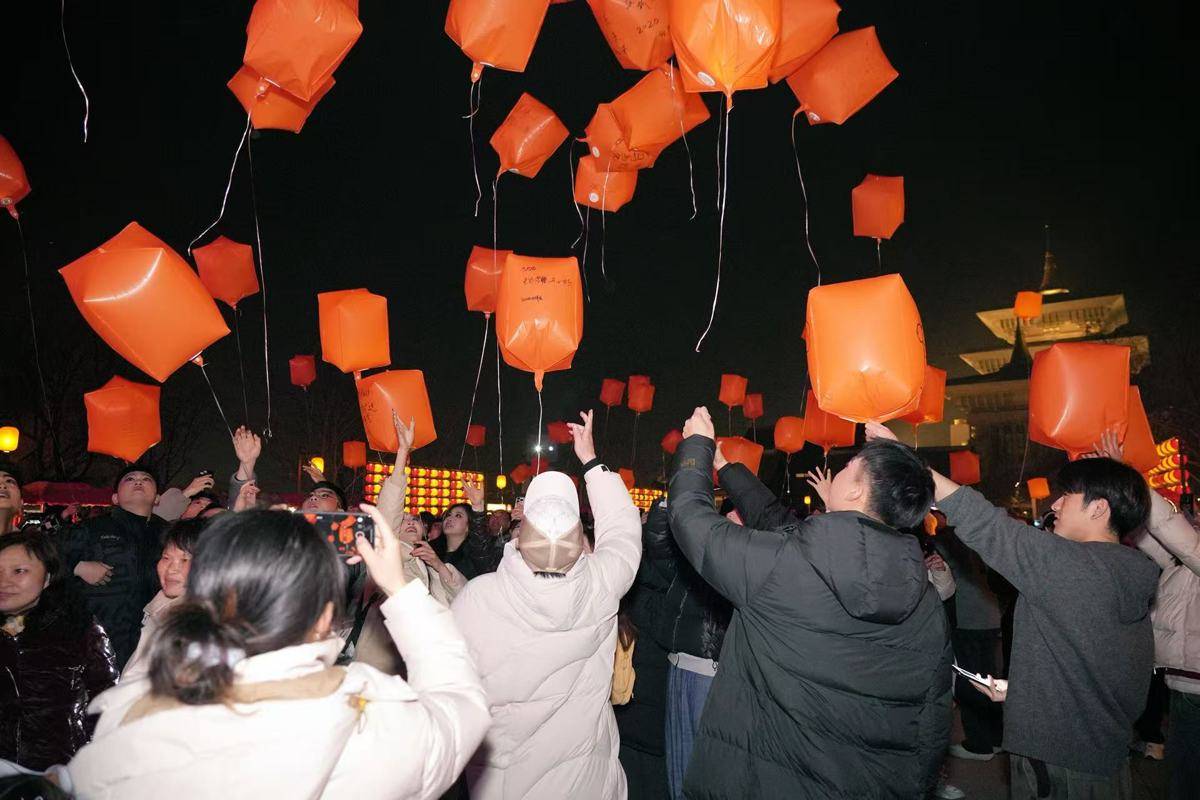 作为黄梅文旅的标杆,东山问梅村在今年春节凭借硬核科技强势“出圈”。当夜幕降临,数百架AI无人机编队腾空而起,以夜空为画布,精准变幻出女驸马、黄梅挑花、锦鲤等经典图案,与璀璨焰火交相辉映 。漫天孔明灯缓缓升空,来自武汉的游客叶女士牵着孩子许下“国泰民安”的心愿。石板路上,鱼灯巡游婉转穿梭;全新创编的贺岁大戏《天官赐福》将山水实景与说唱RAP创新结合,40余场非遗展演让游客沉浸式感受“最潮中国年” 。