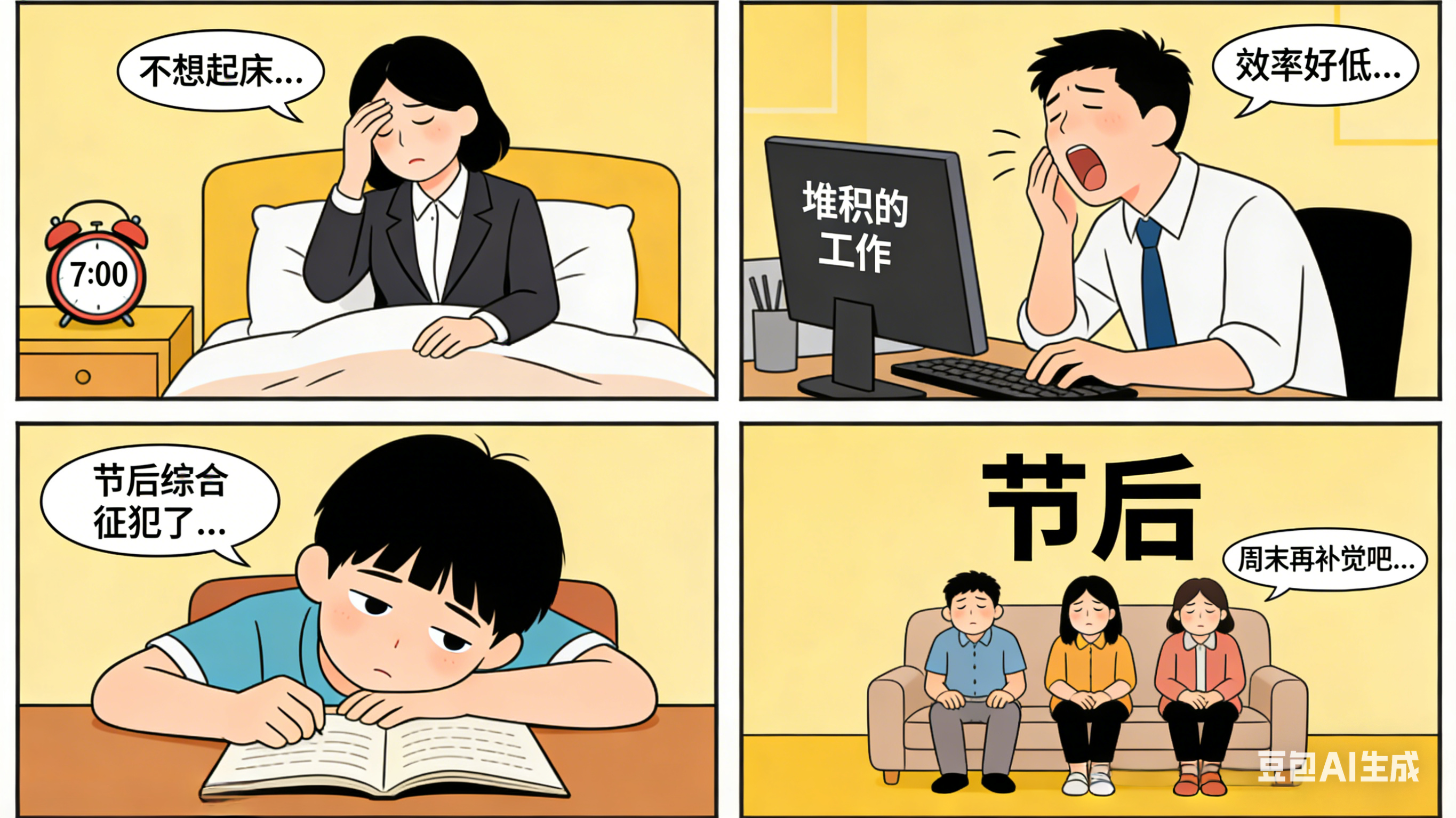 节后综合征是环境状态变化引发的一系列表现,常见的有:作息紊乱、失眠;胃肠道紊乱,如食欲下降、便秘、腹泻等;疲劳综合征,如注意力不集中、脑子迟钝等;拖延,还可能出现抑郁焦虑情绪。