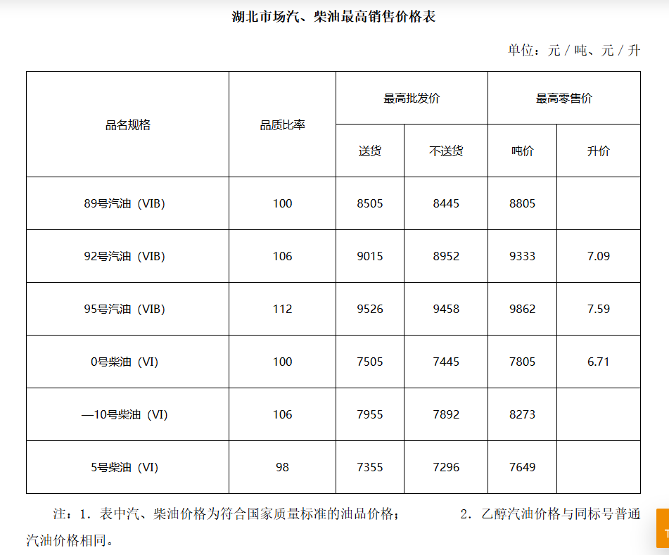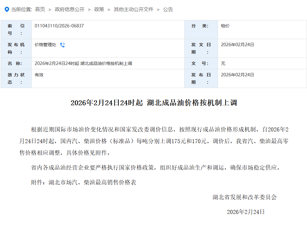 从省发改委获悉,自2月24日24时起,湖北省内92号、95号汽油、0号柴油,每升分别上调0.14元、0.15元、0.15元。