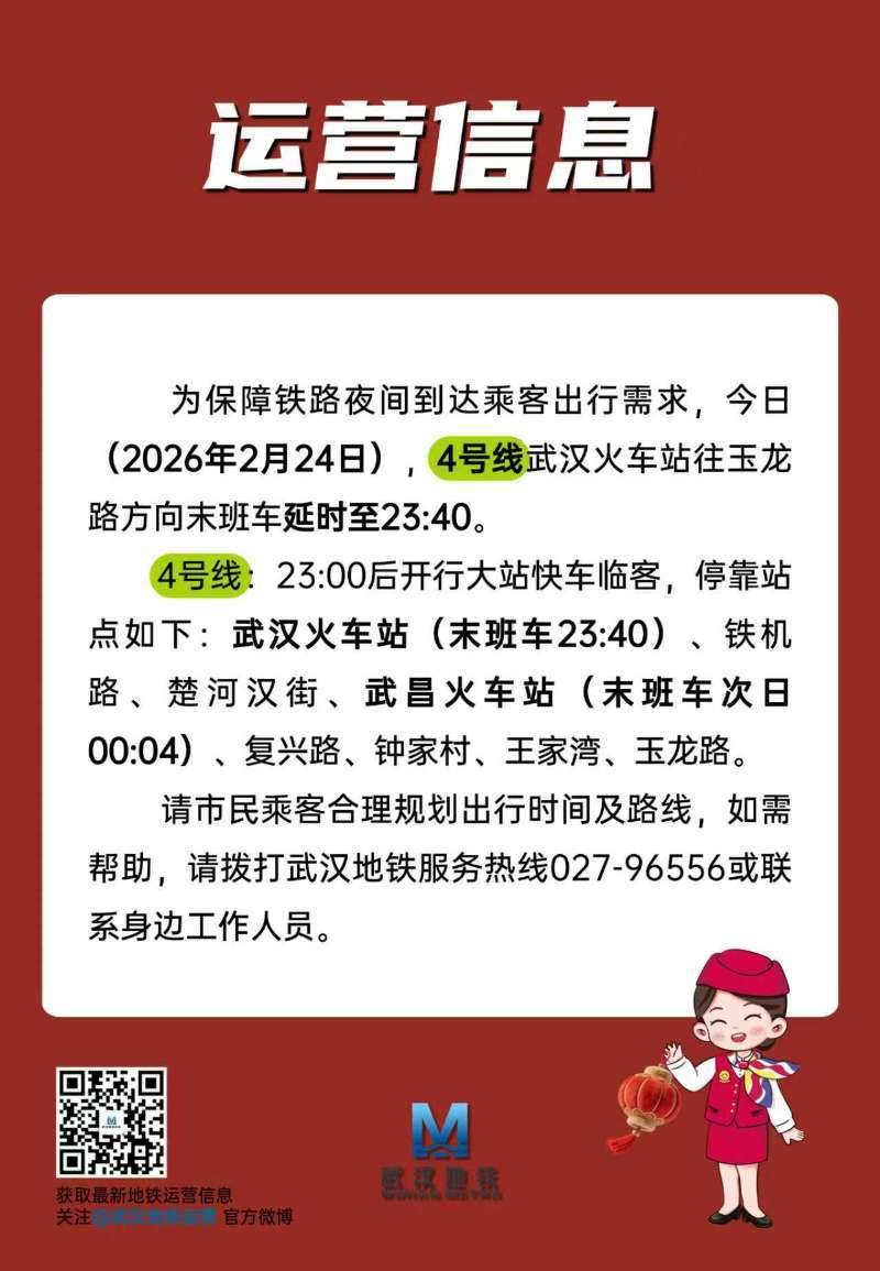 湖北日报讯(记者杨千帆、通讯员产启斗)为保障铁路夜间到达乘客出行需求,2月24日(农历正月初八),武汉地铁4号线延时运营,4号线武汉火车站往玉龙路方向末班车延时至23:40。