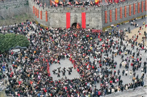 正月初一,荆州古城东门宾阳楼下举办新春开城大典,融合楚式礼乐与新春纳吉,众多游客身着战国袍沉浸式体验荆楚文化。夜幕降临,“凤舞九天”灯光秀以光影勾勒千年文脉,金凤广场上灵动火凤凰引得阵阵惊叹。从街头快闪到夜间光影,荆州以满满诚意让游客感受“年味不打烊”。