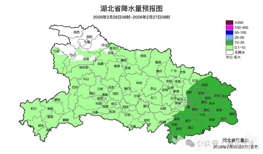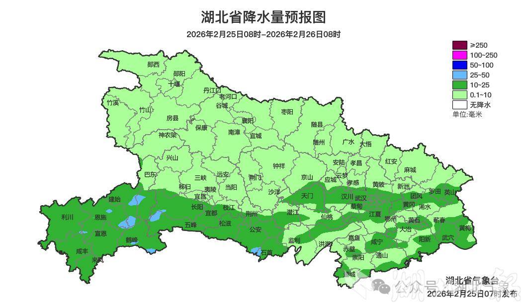 24日,全省以阴天到多云为主,鄂西南和鄂东南部分地区出现小雨、恩施6个乡镇出现中雨。东西部冷暖差异较大,东部地区最高气温仅8至11℃,西部地区普遍在13至20℃。25日早晨到26日早晨,鄂西北、江汉平原北部阴天转小雨;其他地区阴天转小到中雨、局地大雨并伴有雷电。最高气温中西部9至13℃、东部14至18℃,最低气温5至9℃,偏北风2到3级。27日南部地区仍有小雨残留,其他地区转为阴天到多云。但28日雨水还将卷土重来,阴雨天气持续至3月初。预计未来三天气温波动起伏,25日中西部地区最高气温跌至9至13℃、东部14至18℃。26日全省最高气温10至14℃,27日11至16℃。目前仍处于春运返程阶段,雨水再度发展不利于交通出行。气象部门提醒:雨天路面湿滑,能见度降低,驾车时务必“降速、控距、亮尾”,谨慎驾驶,确保行车安全。同时,近期气温起伏较大,提醒大家根据天气变化适时增减衣物,谨防感冒。