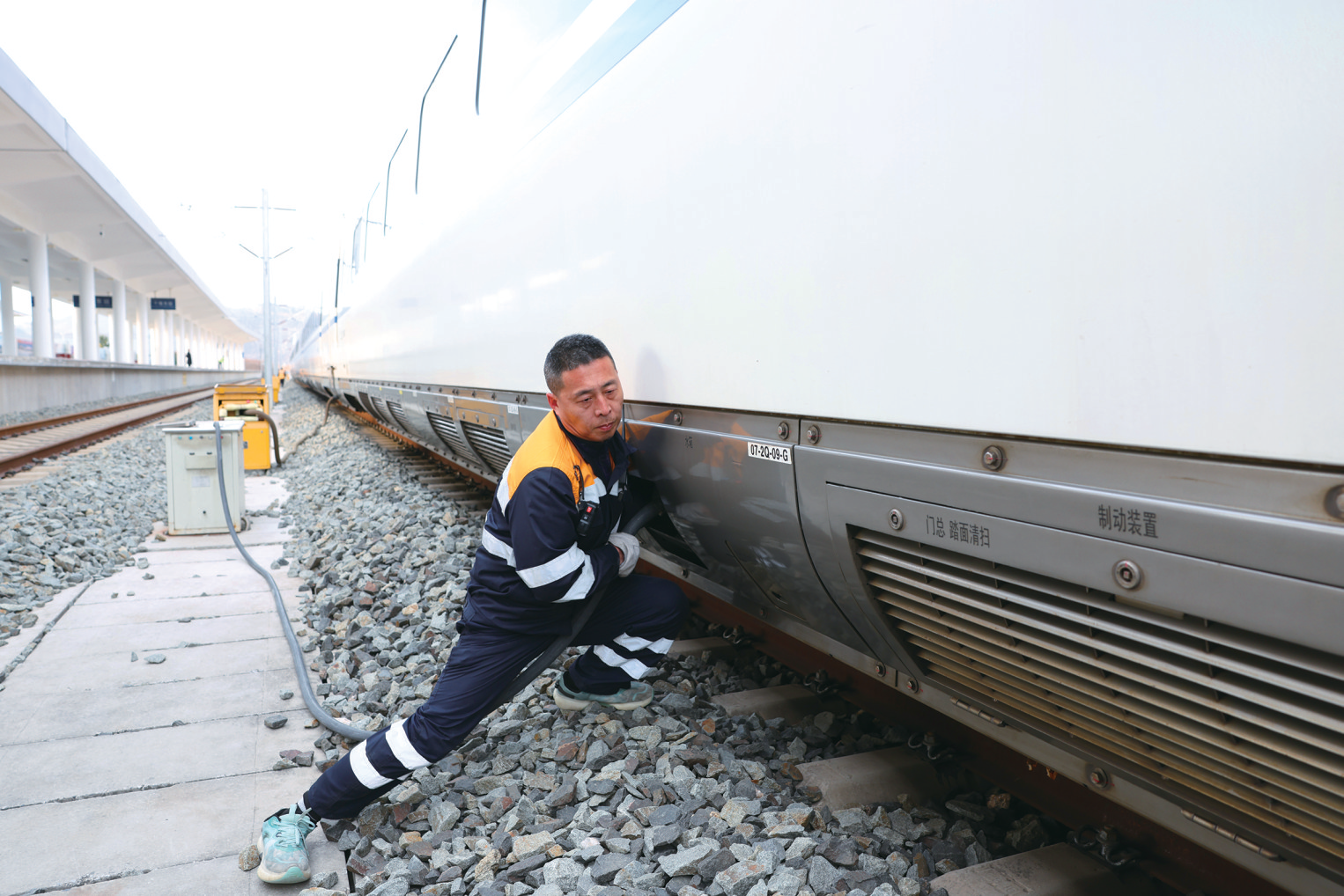 列车进站后,刘磊争分夺秒作业。