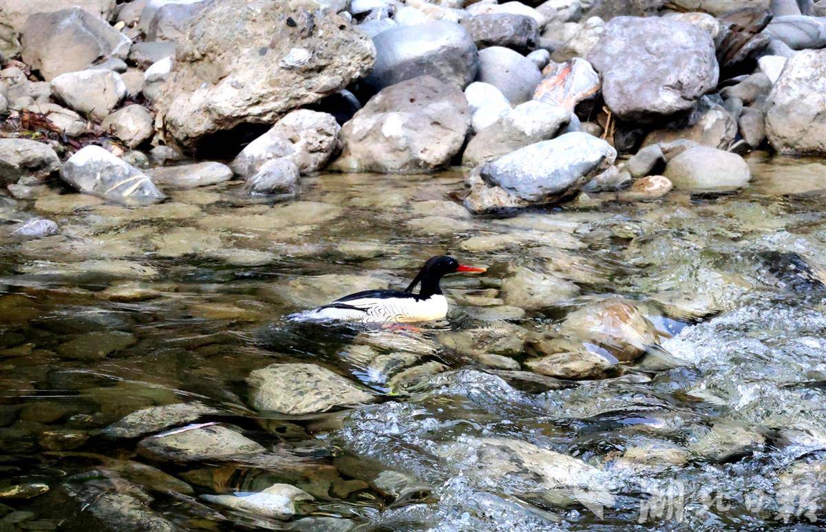 湖北日报讯(通讯员程平、袁孝文)春回大地,万物复苏。2月23日,湖北堵河源国家级自然保护区管理局工作人员在竹山县柳林乡公祖河开展常规水鸟调查监测时,幸运记录到一对素有“鸟中大熊猫”之称的中华秋沙鸭,两只珍稀水鸟在清澈的河面上嬉戏、潜水、觅食,姿态灵动优雅,为春日的堵河源增添了一抹生机与灵动,也再次印证了保护区优良的生态环境。