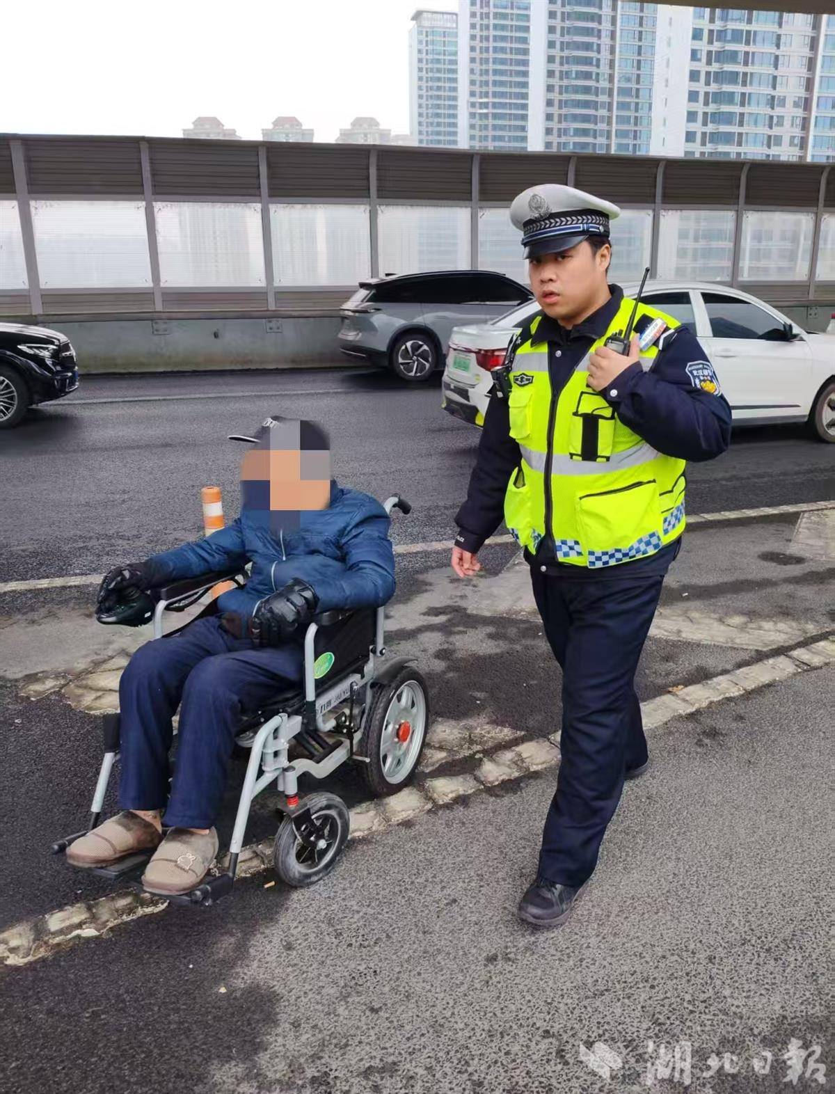 湖北日报讯(记者杨千帆、通讯员黄娟、刘骙)2月25日11时许,武汉青山区交通管理大队五中队民警胡召飞正带领辅警胡伟、胡平、胡灿在二七桥面开展勤务工作。突然,一辆黑色领克SUV驾驶员突然紧急靠边停车,向民警求助称,有一名身体不适的老人驾驶电动轮椅上了高架,已无法驶离匝道。