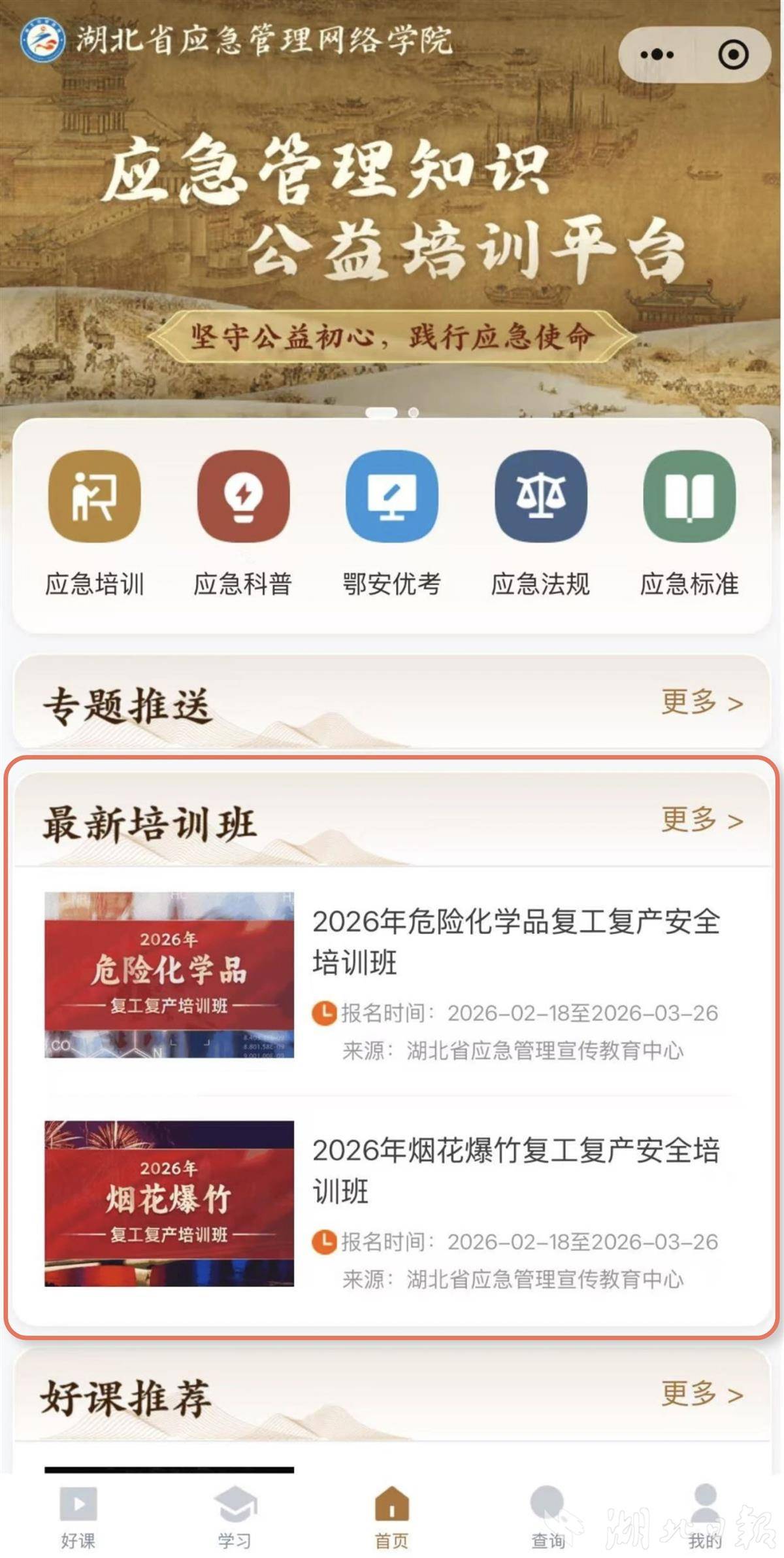 湖北日报讯(记者胡雯洁、通讯员鄂应宣)2月26日,从湖北省应急管理厅获悉,为切实防范化解节后复工复产安全风险,该厅近日推出危险化学品、烟花爆竹、非煤矿山和工贸四大行业专属复工复产安全专题培训班,方便广大企业用户能够随时随地学习安全知识,为企业复工复产保驾护航。