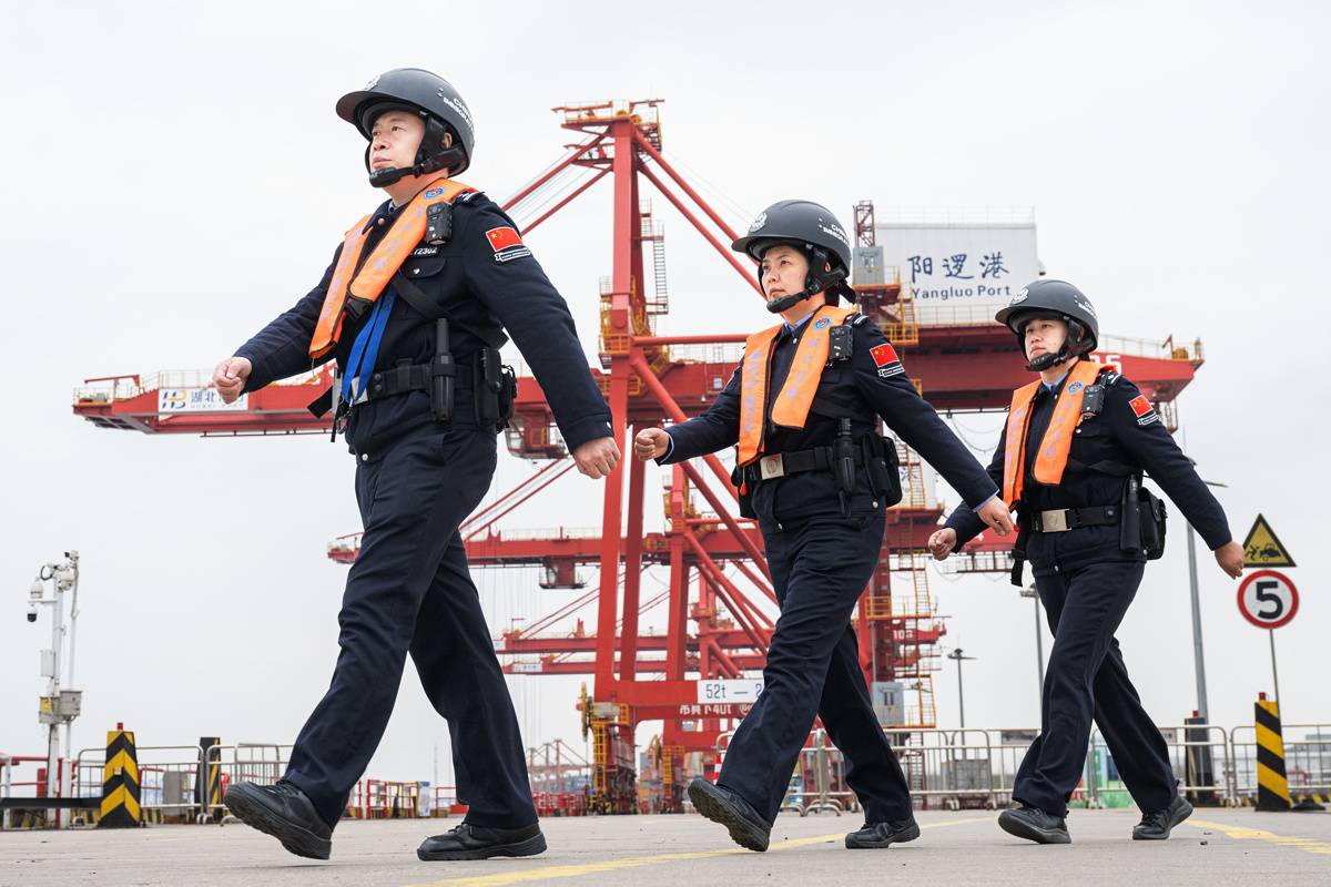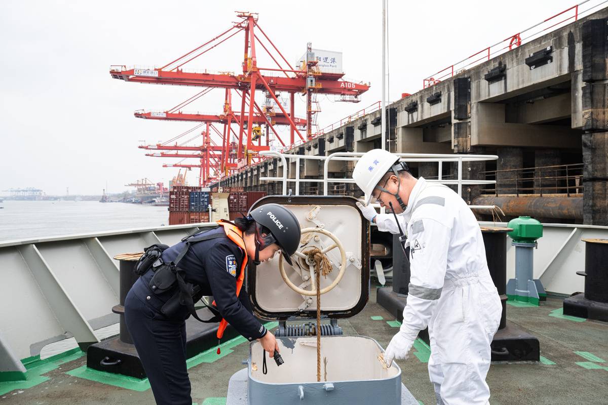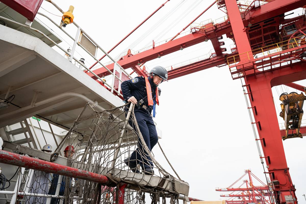 2月25日,在武汉阳逻港国际集装箱码头,汉口出入境边防检查站民警登上准备从武汉出境的“华航汉亚5”轮进行例行检查。近日,武汉阳逻港国际集装箱码头迎来春节假期后的新一轮作业高峰,多艘船舶同时停靠,码头上一派繁忙景象。2月24日,由日本名古屋驶来的“华航汉亚1”船舶顺利靠泊武汉阳逻港,这也是丙午马年长江中上游迎来的首艘江海直航入境船舶。(湖北日报全媒记者 任勇 通讯员 胡艳 摄)