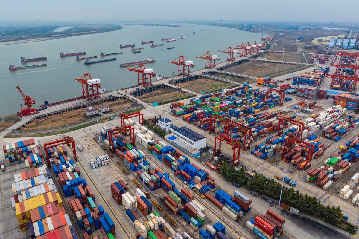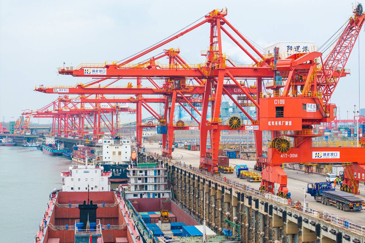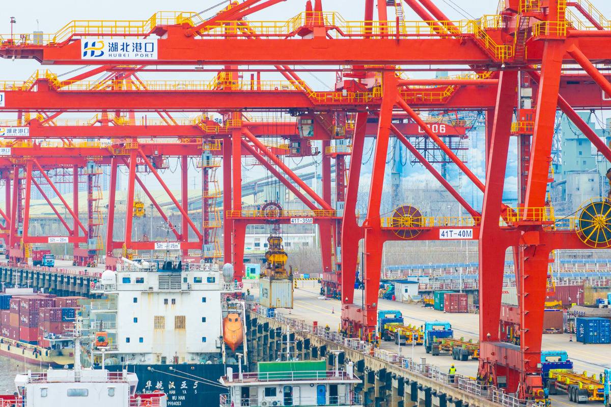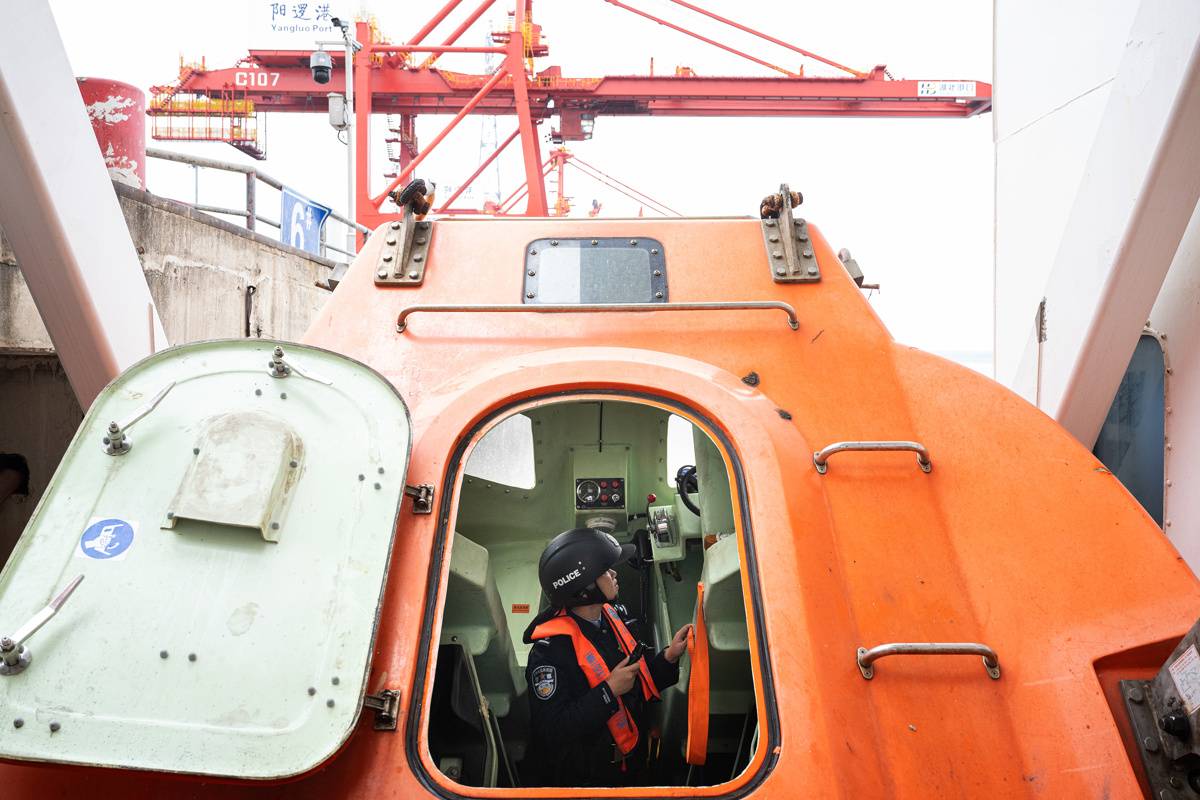 2月25日,在武汉阳逻港国际集装箱码头,汉口出入境边防检查站民警登上准备从武汉出境的“华航汉亚5”轮进行例行检查。近日,武汉阳逻港国际集装箱码头迎来春节假期后的新一轮作业高峰,多艘船舶同时停靠,码头上一派繁忙景象。2月24日,由日本名古屋驶来的“华航汉亚1”船舶顺利靠泊武汉阳逻港,这也是丙午马年长江中上游迎来的首艘江海直航入境船舶。(湖北日报全媒记者 任勇 通讯员 胡艳 摄)