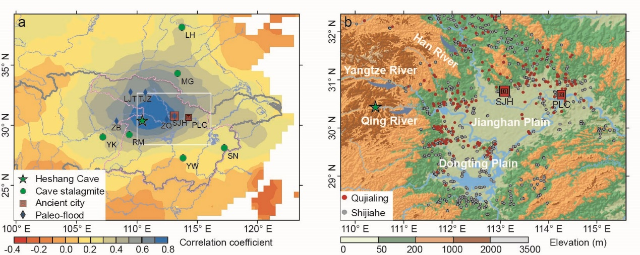 (a)古气候记录和古洪水记录分布图,背景颜色代表和尚洞地区与其他地区降水(1950-2016年)的相关性图;(b)屈家岭和石家河文化遗址分布图。