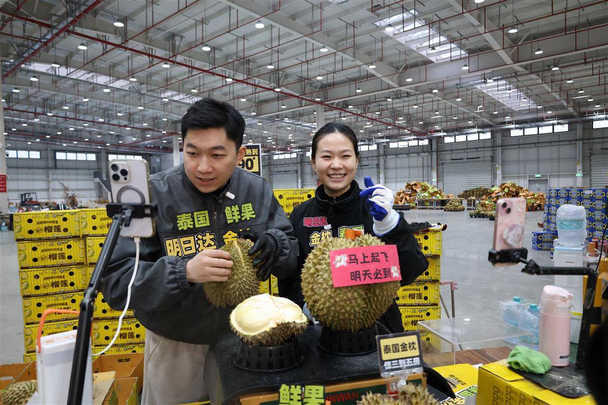 在花湖国际机场边直播卖榴莲,主播月入5万。图为21岁的大学生于润雅(右)和搭档正在直播。湖北日报全媒记者周鹏摄