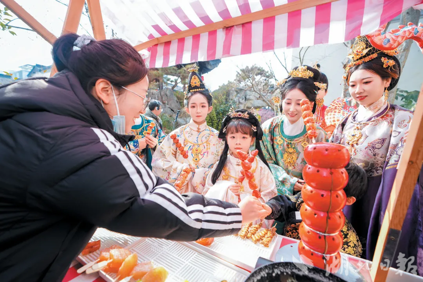 车城路街道四方新城小区的年味,藏在家门口的集市里。冰糖葫芦、糖画等民俗小吃飘香,明制马面裙、飘逸披风的汉服爱好者穿梭其间,古典雅致的装扮与红火集市相映成趣。这场集便民服务、文化体验、民俗展示于一体的年味集市,吸引了周边居民踊跃参与,男女老少结伴逛市集、话家常,欢声笑语中,邻里距离悄然拉近,让新春的温暖在社区里静静流淌。