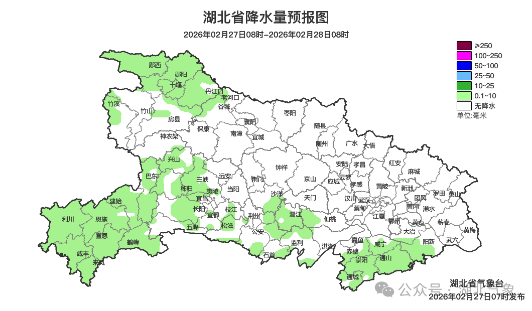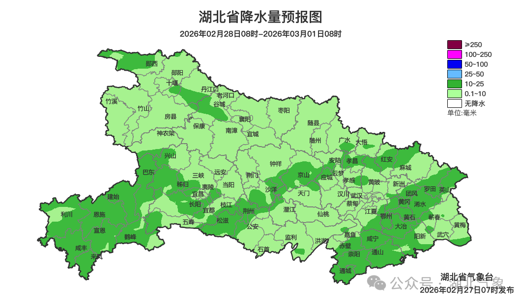 湖北日报讯(记者曾莉)2月27日,湖北大部地区雨水暂歇,但阴云笼罩,体感依旧湿冷。预计接下来两天雨水将再度来袭,不过受暖湿气流影响,本次降雨过程东部地区气温会升至14至20℃。由于近期气温偏暖,武汉已于2月19日正式进入气象学意义上的春天,此次入春时间较常年入春时间(3月5日)偏早14天,为近20年第3早。不过春季冷暖变幅较大,预计有2至3次较强冷空气活动,3月下旬后期至4月上旬前期,武汉可能发生倒春寒及阶段性连阴雨过程。气象专家介绍,27日全省以阴天为主,仅鄂西北及南部局地有小雨残留。28日和3月1日雨水再度来袭,全省有小到中雨。气温方面,27日全省最高气温11至15℃。28日中西部地区气温将降至9至14℃,东部地区则升至14至20℃。随着冷空气南下,3月1日全省气温有所下滑,鄂西北6至9℃,其他地区9至14℃。未来三天风力较大,偏北阵风可达5到8级。