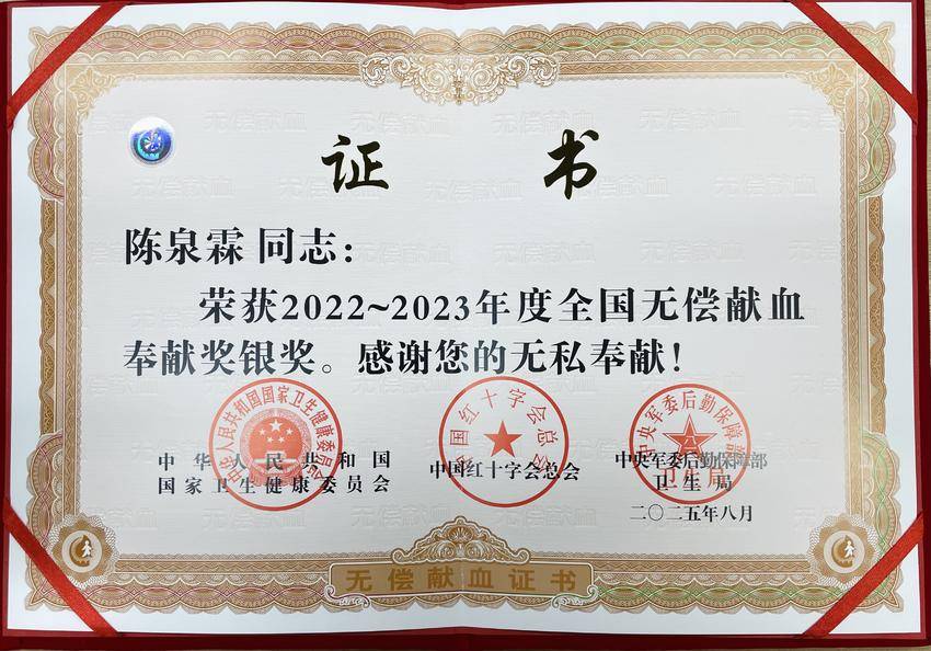 “全国无偿献血奉献奖银奖”,是国家对无偿献血者的极高褒奖,要求自愿无偿献血达30次及以上。今年57岁的陈泉霖自1991年开始参与无偿献血,累计献血量达7600ml。在无偿献血的道路上,他从未因年龄和工作的繁忙而停下脚步。献血证上密密麻麻的记录,见证了他一次又一次的爱心接力。