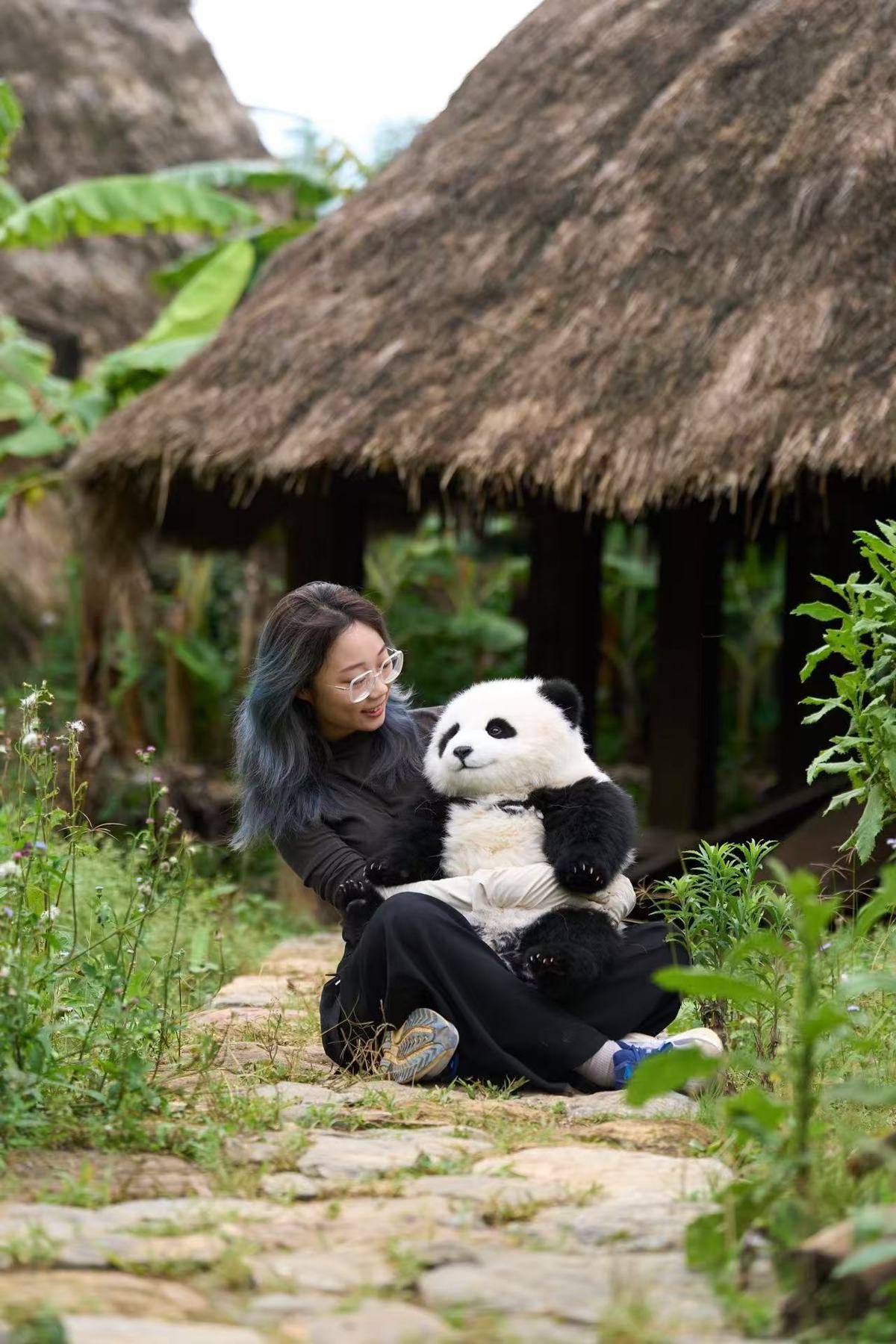 鲍海姗和剧中的熊猫“胡胡”模型合影。受访者供图