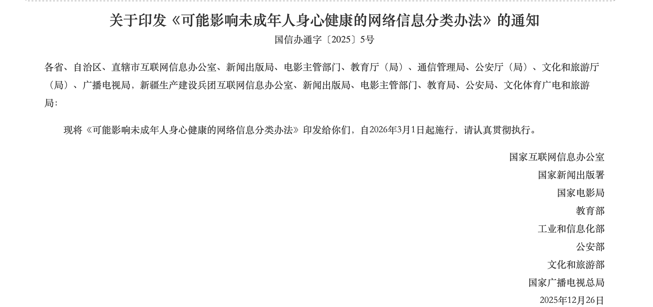 《可能影响未成年人身心健康的网络信息分类办法》中,提到可能影响未成年人身心健康的网络信息,是指除法律法规规定的含有危害未成年人身心健康内容的违法信息外,通过互联网发布传播的可能引发或者诱导未成年人模仿不安全行为、实施违反社会公德行为、产生极端情绪、养成不良嗜好等的信息。