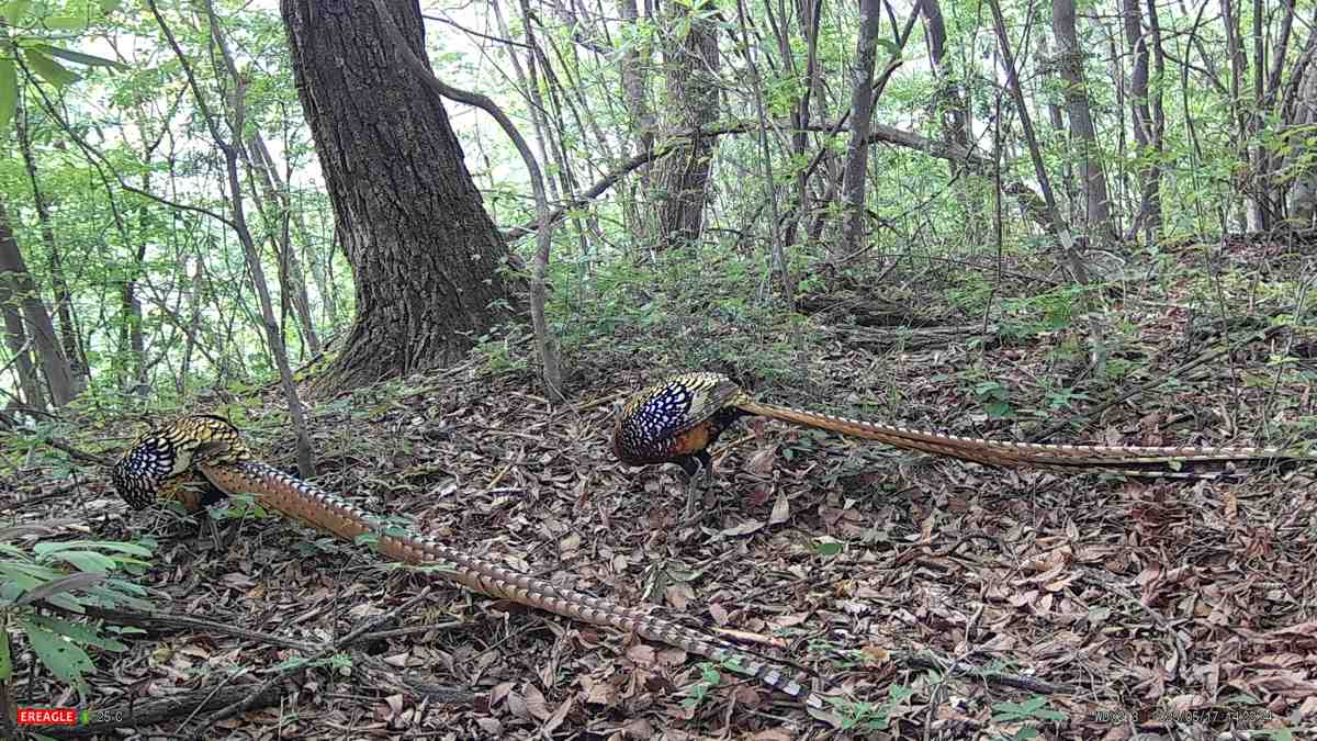 国家一级重点保护野生动物白冠长尾雉,在湖北五道峡国家级自然保护区内觅食。(红外相机画面)