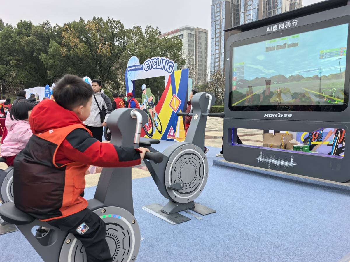 小朋友体验虚拟骑行项目。(湖北日报全媒记者 童军鹏 摄)