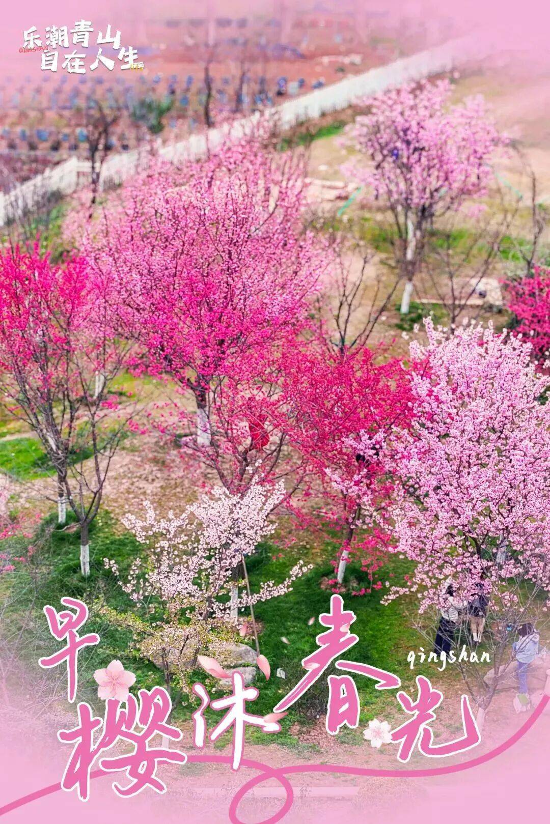 粉霞满枝、如云似雾;