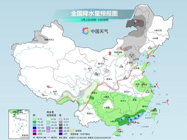 今天(3月2日),中东部降水将有所减少减弱,但江南、华南等地仍有较大范围降雨,强降雨分布较零散。受冷空气和阴雨雪共同影响,本周北方多地气温波动明显,华北一带体感湿冷,公众外出需添衣保暖。