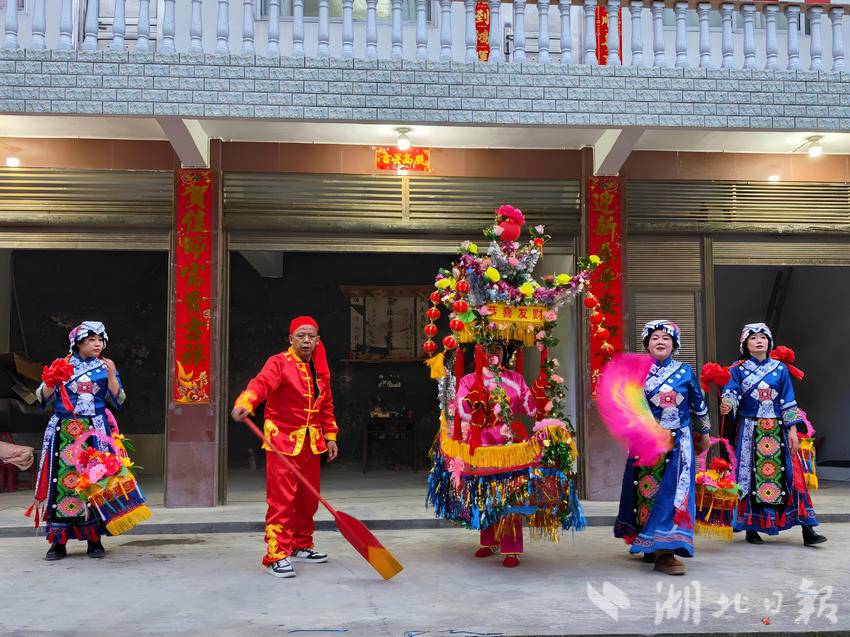 湖北日报客户端讯(通讯员舒淑、甄亚芳、范力中)2月28日,咸丰县活龙坪乡晓溪村热闹起来。活龙民间艺术团的彩莲船表演队专程来到见义勇为先进人物谭弟咸家中,为他表演传统彩莲船,送上新春祝福。