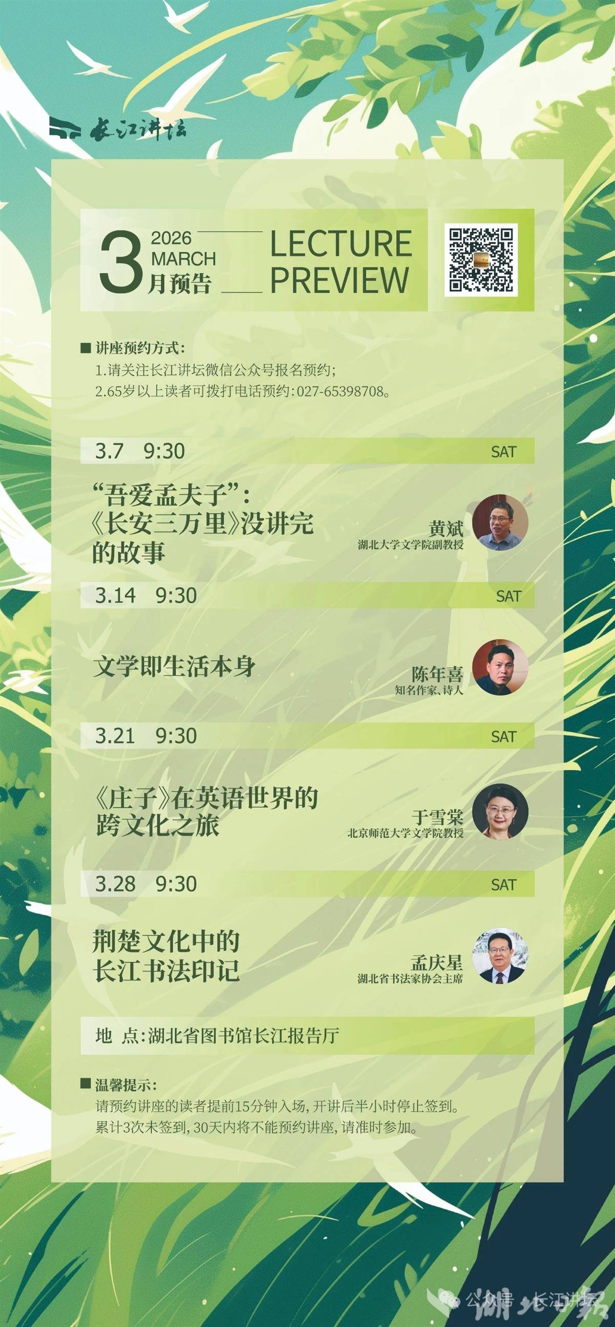 湖北日报讯(记者王晶、通讯员谢宁)3月2日,湖北省图书馆长江讲坛发布3月讲座预告,4场讲座将在春风里迎接读者。