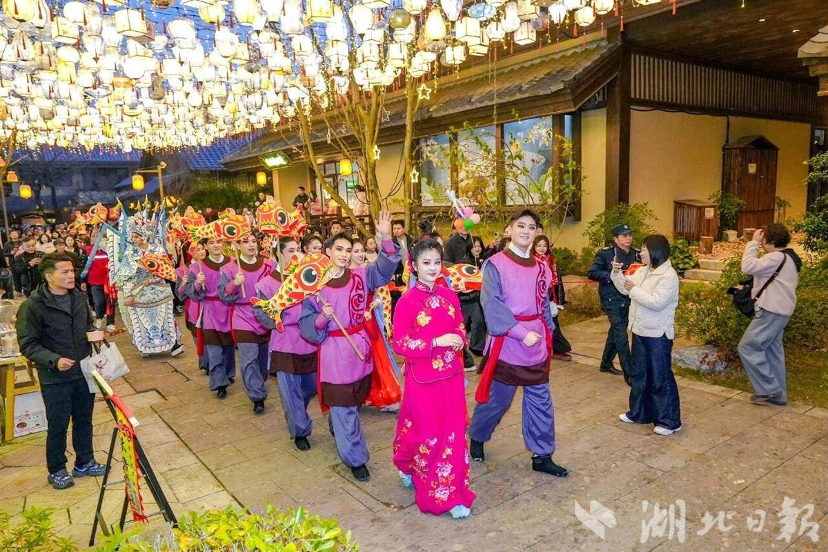 当夜幕降临,最令人期待的鱼灯巡游将穿过青石板巷——盏盏鱼灯流光溢彩,摇曳生姿,一群灵动的锦鲤在夜色中穿梭游弋,如梦似幻。此时,无人机方阵将在夜空变幻图案,更有盏盏孔明灯承载着心愿缓缓升空,与星月同辉。婉转的黄梅戏、唯美的国风舞蹈与刚劲的武戏精粹也将轮番上演。传统与新潮在这里碰撞,给您一个热闹团圆的元宵夜!