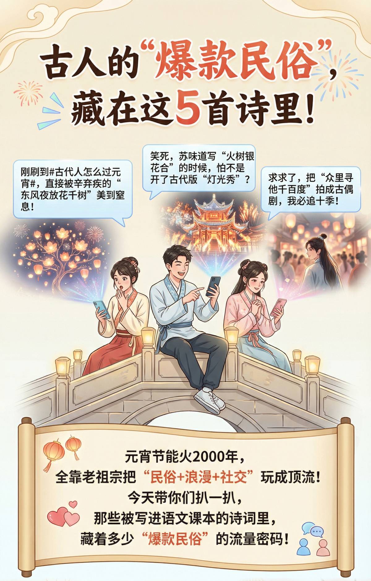 元宵节能火2000年,全靠老祖宗把“民俗+浪漫+社交”玩成顶流!今天带你们扒一扒,那些被写进语文课本的诗词里,藏着多少“爆款民俗”的流量密码!
