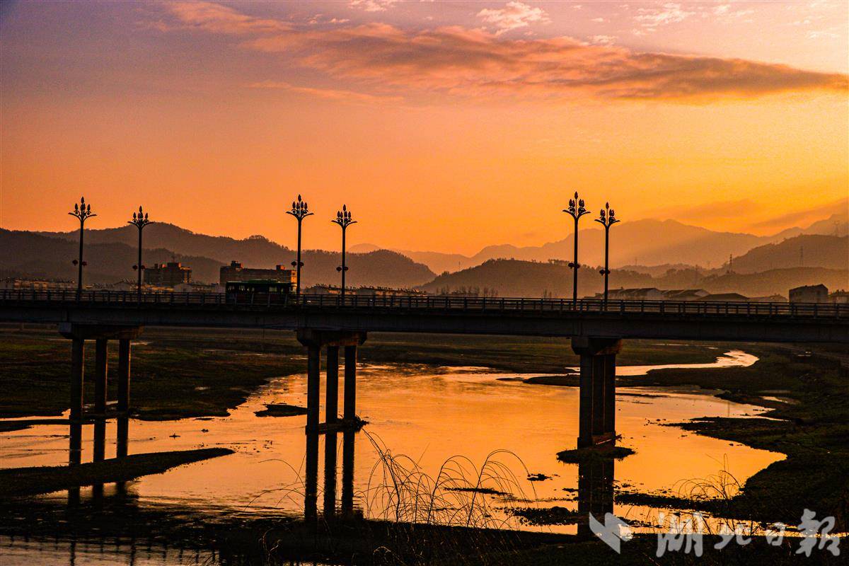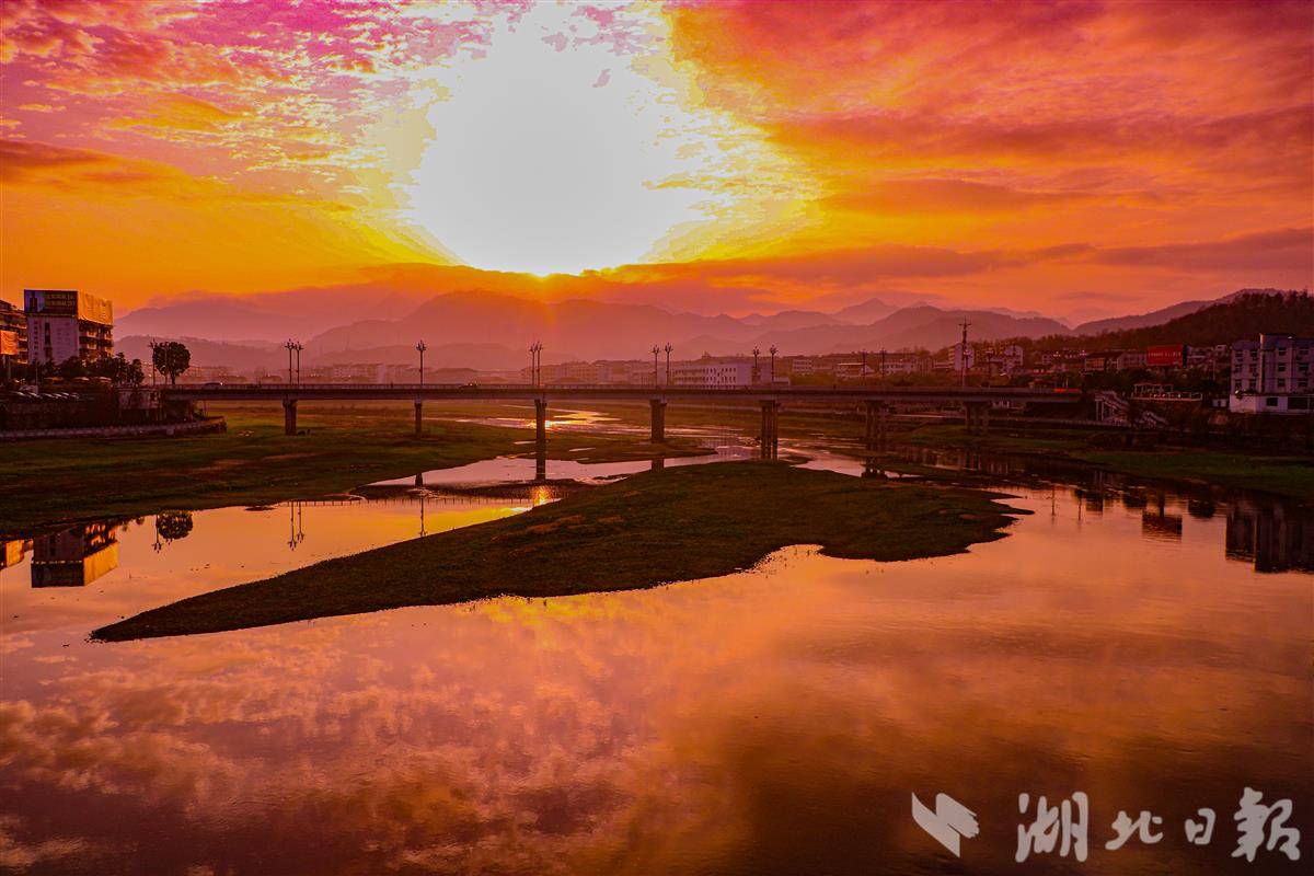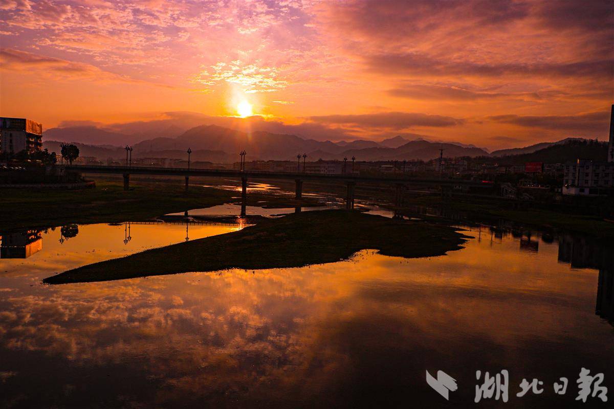 湖北日报讯(通讯员付向阳)3月3日,雨后初晴,天空被染成一片金色,似火的朝霞映红了整个天际,一轮红日映照清晨的英山县城,水面如镜,水天一色,桥梁、城市、河流沐浴在朝霞之中,营造出一幅绝美的早春山水画。