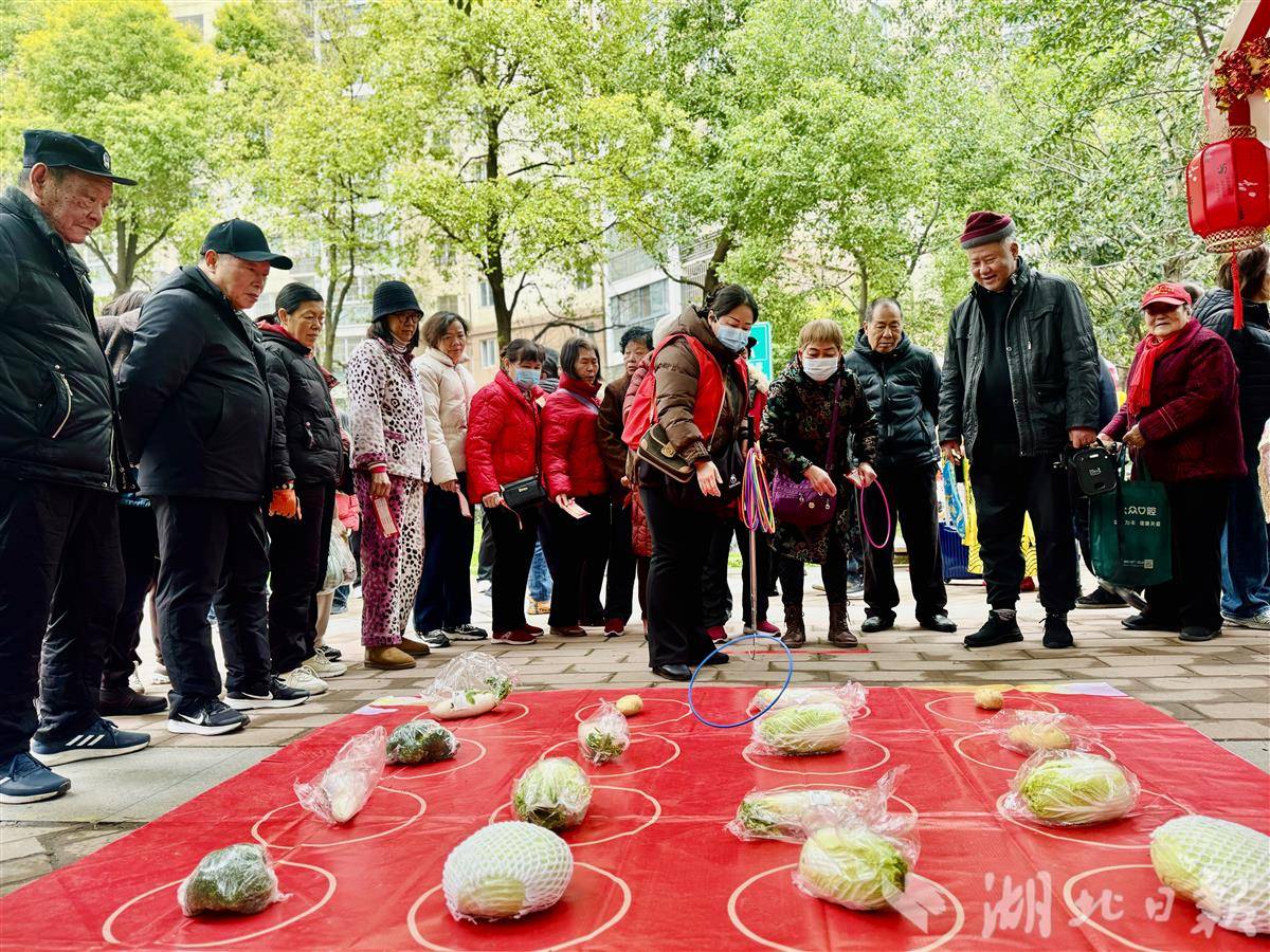 民俗展演过后,社区八大互动摊位同步开放,人头攒动、热闹非凡。吉圈纳福摊位前,居民排队参与套圈,西蓝花、土豆等新鲜蔬菜整齐摆放,大人小孩轮番上阵,收获满满、趣味十足。灯谜寻春摊位前,不少居民驻足思索,灯谜涵盖传统习俗、生活常识,更巧妙融入廉洁家风、廉政知识,大家在猜谜兑奖的过程中,实现寓教于乐、以谜倡廉。福签祈祥、冰壶逐喜等摊位同样人气高涨,居民抽福签、比技巧,在欢乐中收获祝福与惊喜。
