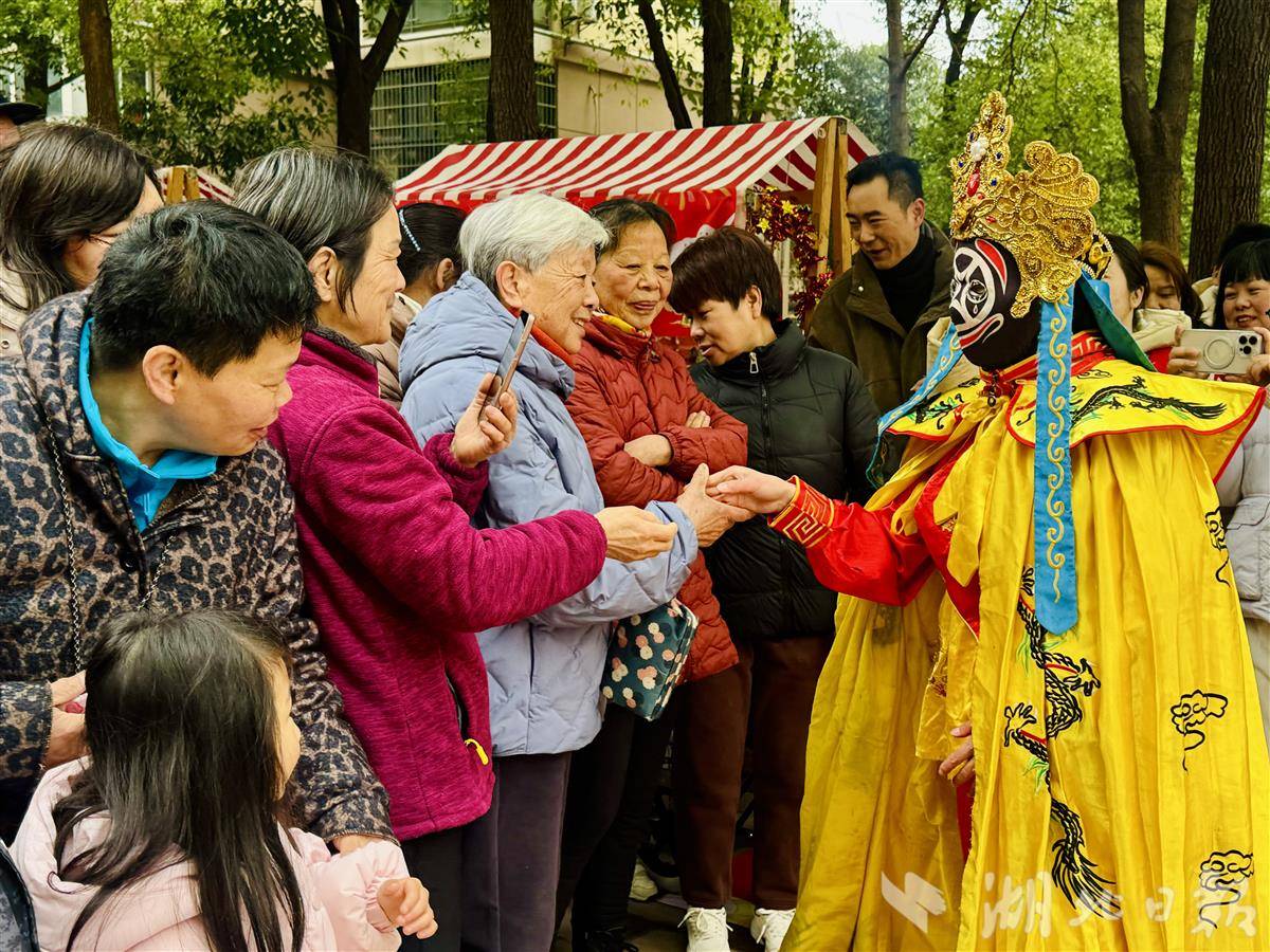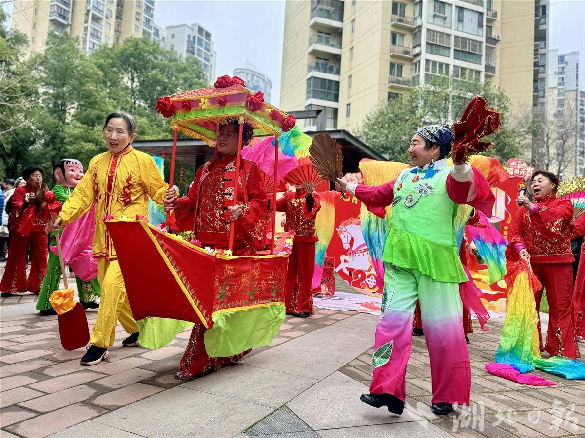 活动在气势昂扬的腰鼓表演中拉开帷幕,表演者精神饱满、鼓点铿锵,红绸翻飞、鼓声阵阵,瞬间点燃现场气氛。独具武汉本土特色的陆地划龙船表演紧随其后,演员身着传统服饰,和着鼓点整齐行进,摇桨、转身、互动一气呵成,生动展现非遗民俗魅力。压轴登场的川剧变脸表演将气氛推向高潮,演员身段利落、脸谱瞬息万变,与观众近距离互动,引得现场掌声与欢呼声不断。