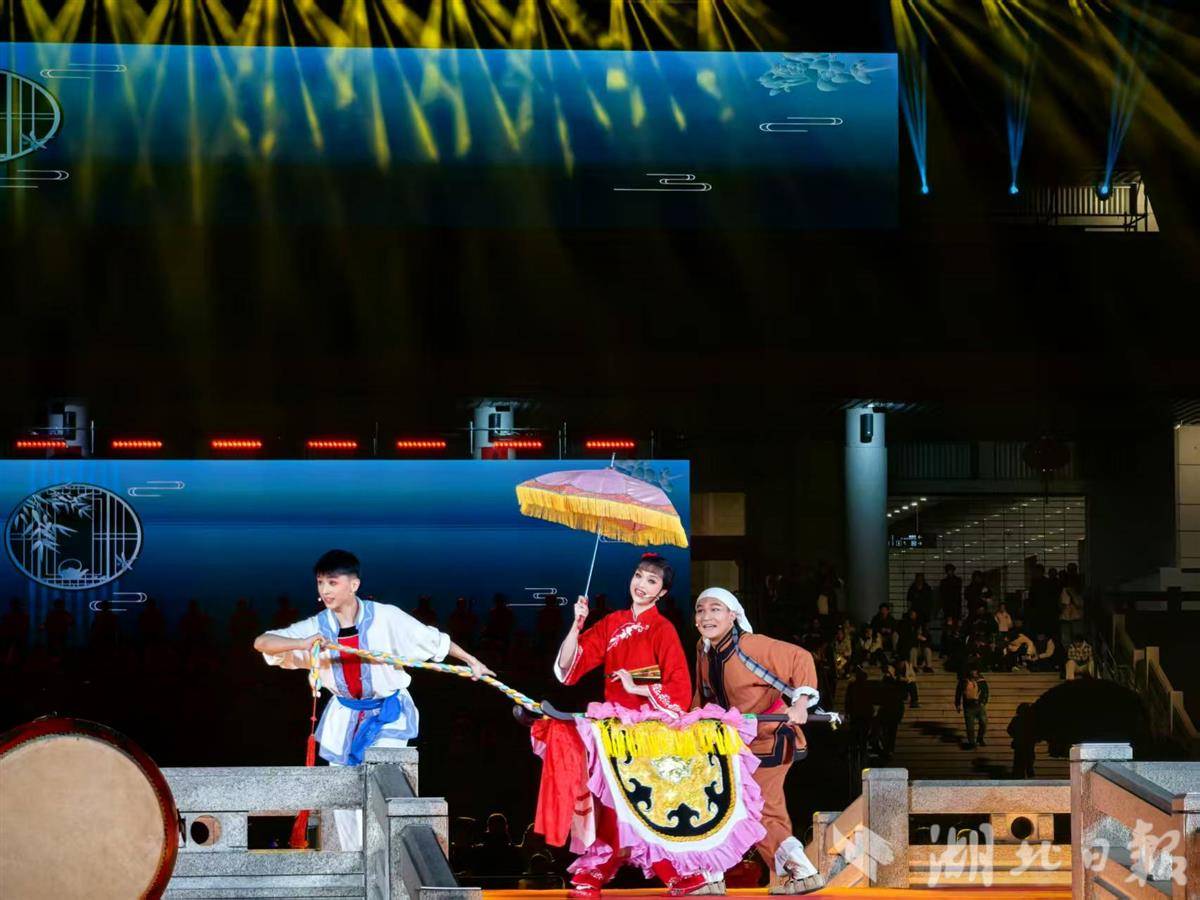 “相好的人儿结同心,咿呀黑。”以小桥为舞台,京剧、汉剧、楚剧、黄梅戏、花鼓戏等轮番登台,《天女散花》《贵妃醉酒》《夫妻观灯》《推车赶会》等,热闹喜庆、韵味十足,老年戏迷跟着哼唱,年轻人、小朋友也被看得津津有味。