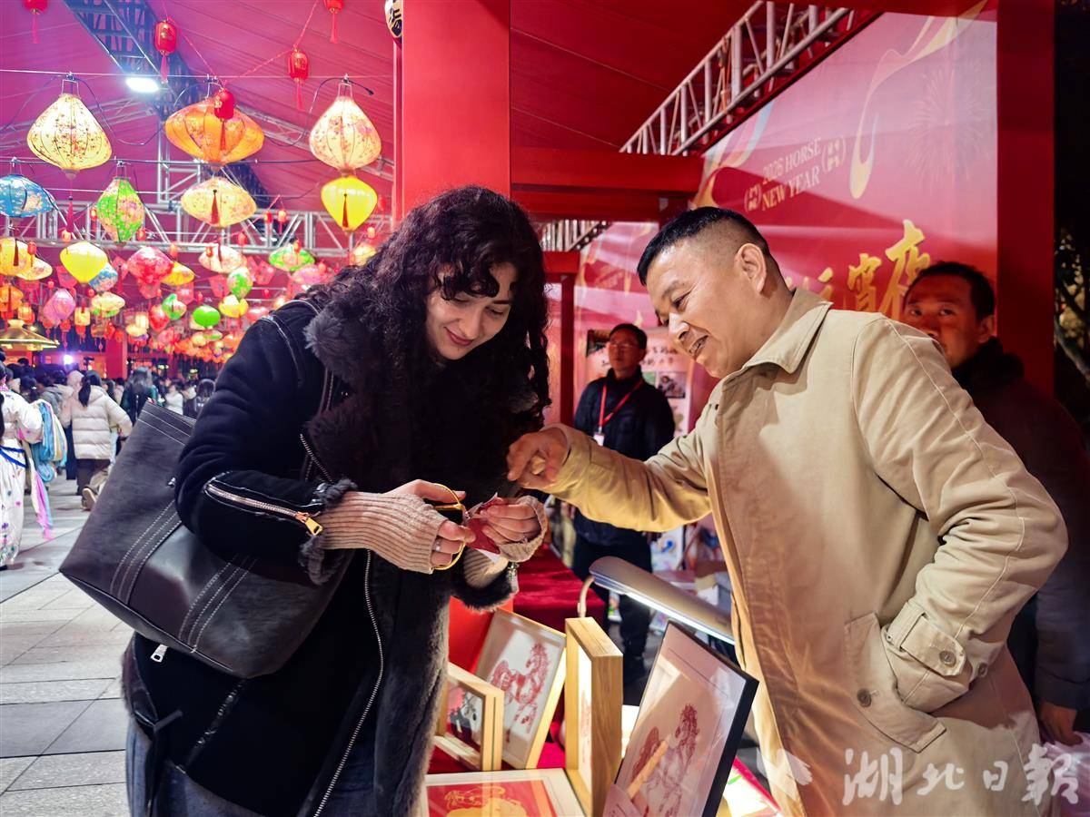 北广场两侧,东市工艺文创市集与西市美食品鉴市集人头攒动、烟火升腾。今年非遗集市突出互动、体验,吸引不少游客动手体验,感受非遗之美。“我叫马心怡,马年的马”,来自俄罗斯的留学生马心怡跟着非遗传承人学起武汉剪纸,有模有样,一镂一剪间一幅《六福迎春》在手中出现。“编钟豆糕”“剑柄糖画”等创意美食备受欢迎,一碗热干面、孝感米酒等湖北传统美食也吸引了不少外地游客品尝。现场一口大锅里热气腾腾的汤圆,让游客甜在嘴里、暖在心头。