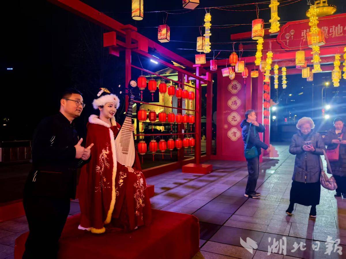 3月3日晚,游客与“王昭君”同框庆元宵节。(湖北日报全媒记者海冰摄)