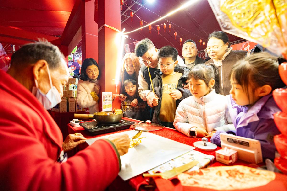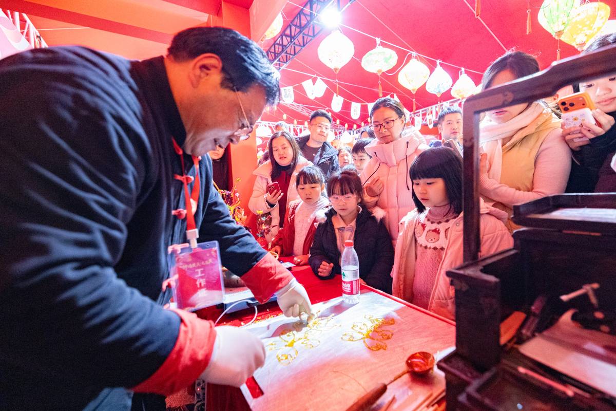 2026年3月3日,元宵佳节夜,湖北省博物馆“钟鸣楚天元宵夜” 主题灯会精彩上演,图为游客们围观非遗匠人画糖画。(湖北日报全媒记者 何宇欣 通讯员 黄敏 摄)
