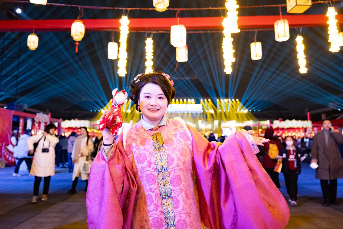 2026年3月3日,元宵佳节夜,湖北省博物馆“钟鸣楚天元宵夜” 主题灯会精彩上演,图为游客身着汉服在花灯下拍照打卡。(湖北日报全媒记者 何宇欣 通讯员 黄敏 摄)