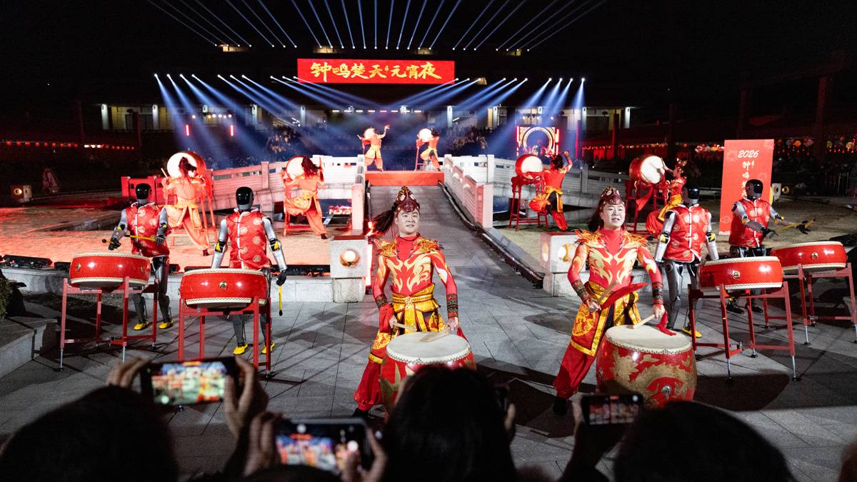 2026年3月3日,元宵佳节夜,湖北省博物馆“钟鸣楚天元宵夜” 主题灯会精彩上演,图为灯会现场人形机器人与演员们一同擂鼓表演。(湖北日报全媒记者 何宇欣 通讯员 黄敏 摄)