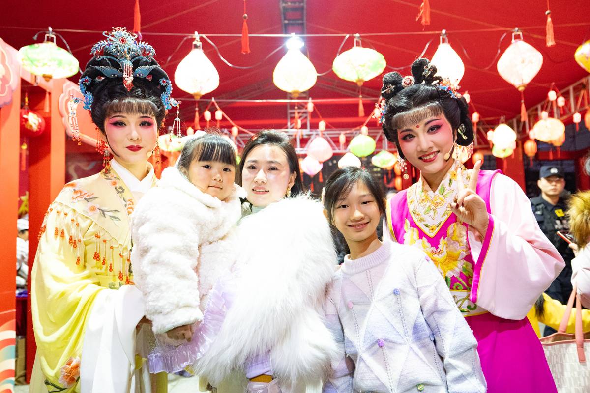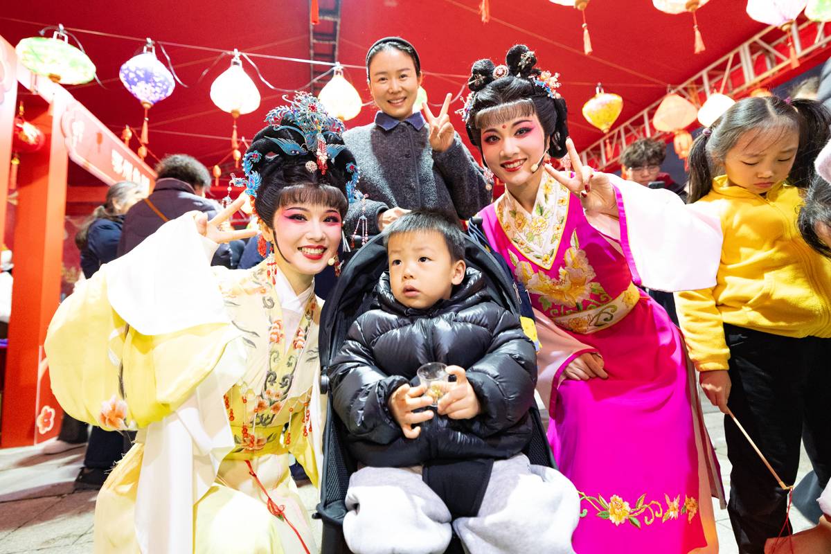 2026年3月3日,元宵佳节夜,湖北省博物馆“钟鸣楚天元宵夜” 主题灯会精彩上演,图为身着汉服的演员与游客们合影留念。(湖北日报全媒记者 何宇欣 通讯员 黄敏 摄)
