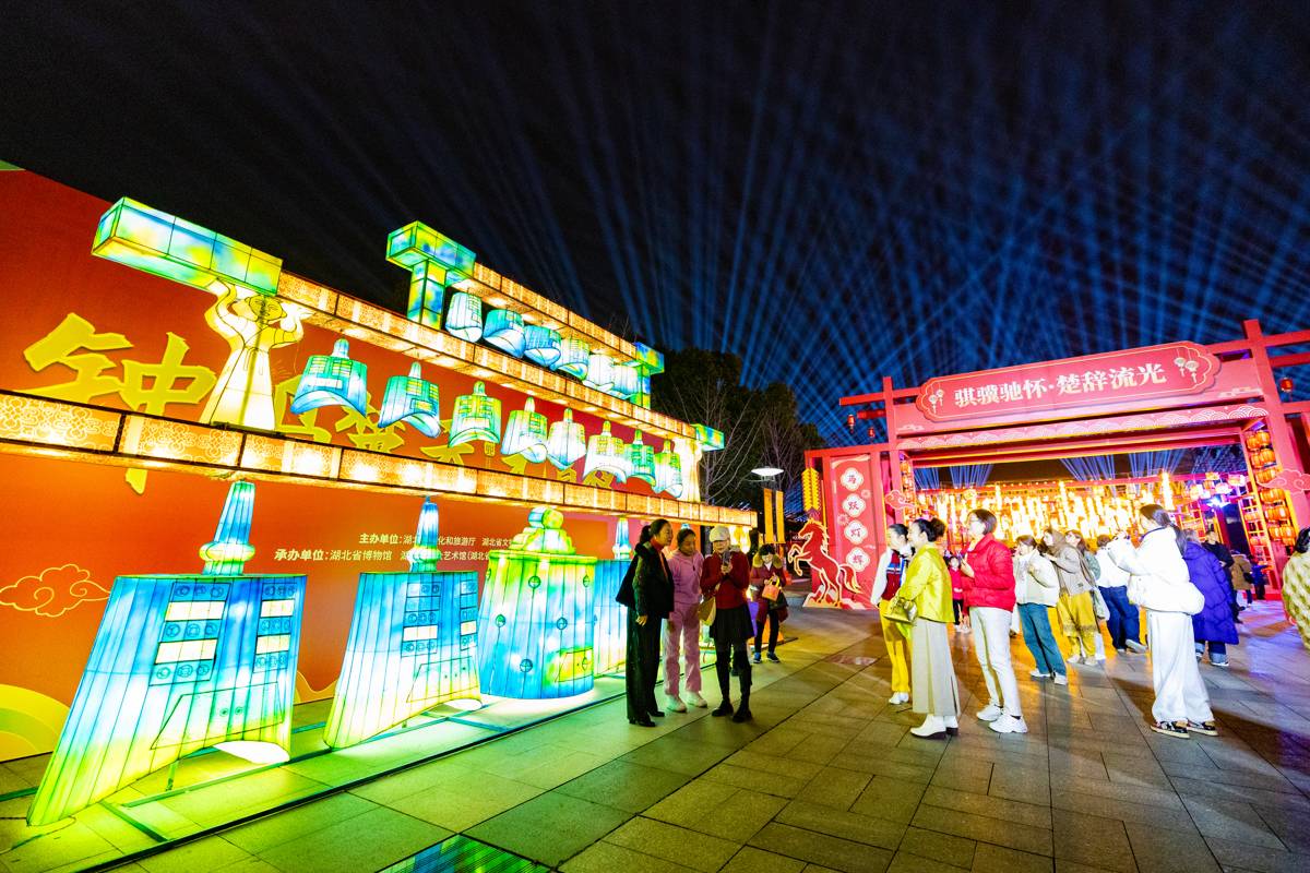 2026年3月3日,元宵佳节夜,湖北省博物馆“钟鸣楚天元宵夜” 主题灯会精彩上演,图为游客正在欣赏花灯。(湖北日报全媒记者 何宇欣 通讯员 黄敏 摄)