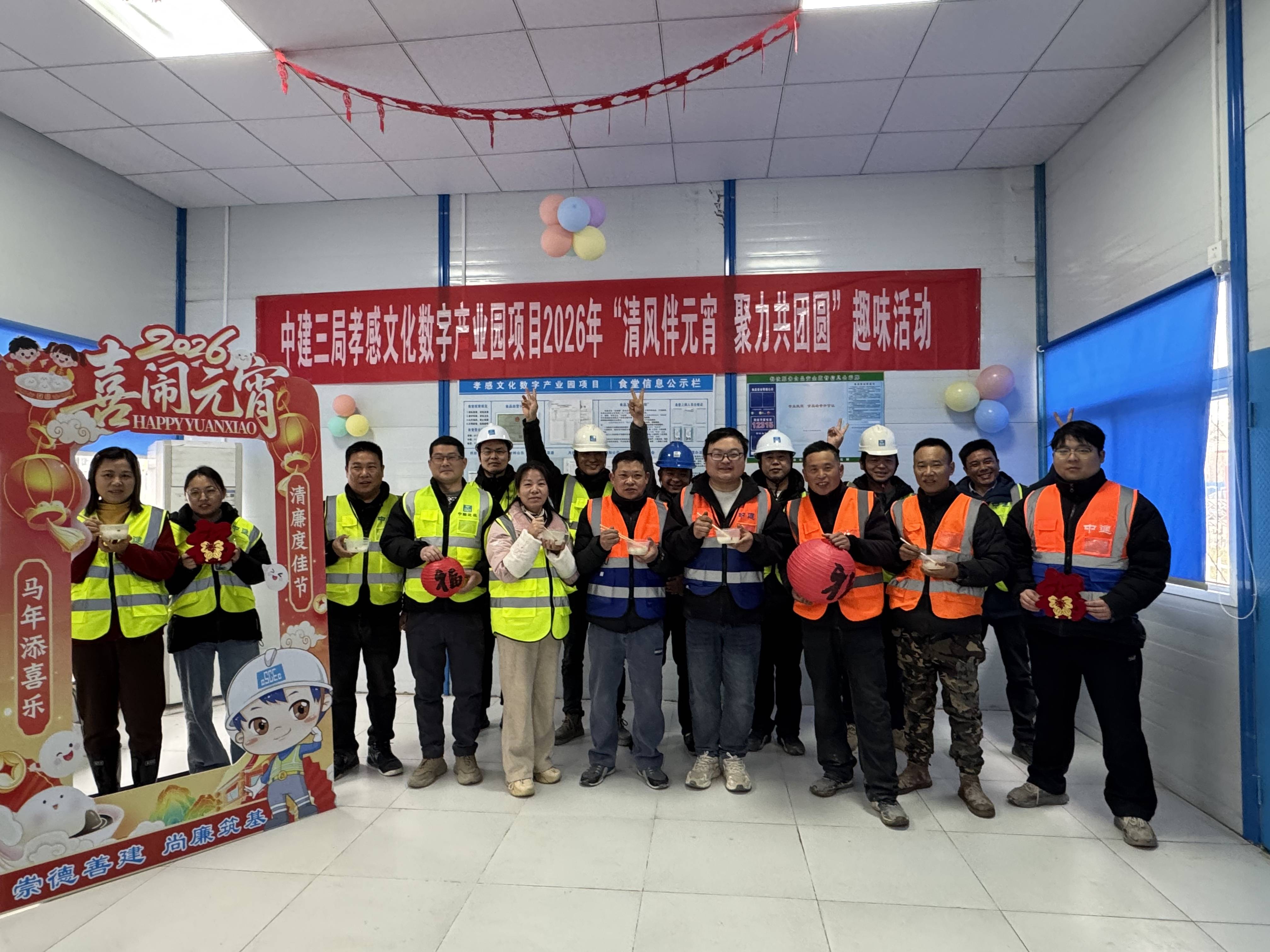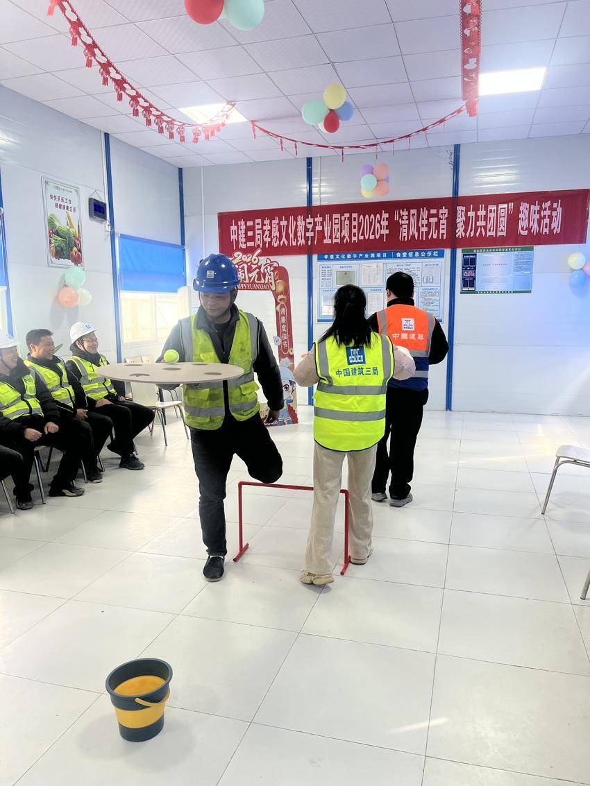 湖北日报讯(通讯员陈亚妮)趣味互动游戏、品美味汤圆、打卡拍照……元宵佳节,中建三局总承包公司湖北公司孝感文化数字产业园项目部组织管理人员和劳务队伍工友代表一起开展“清风伴元宵、聚力共团圆”元宵节趣味团建活动。