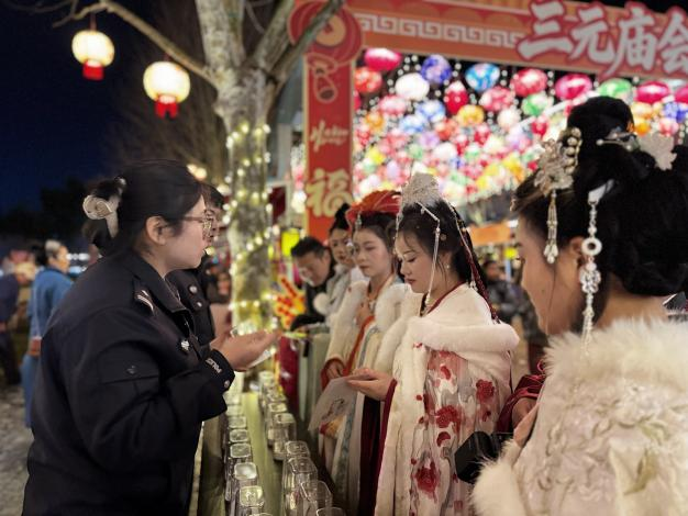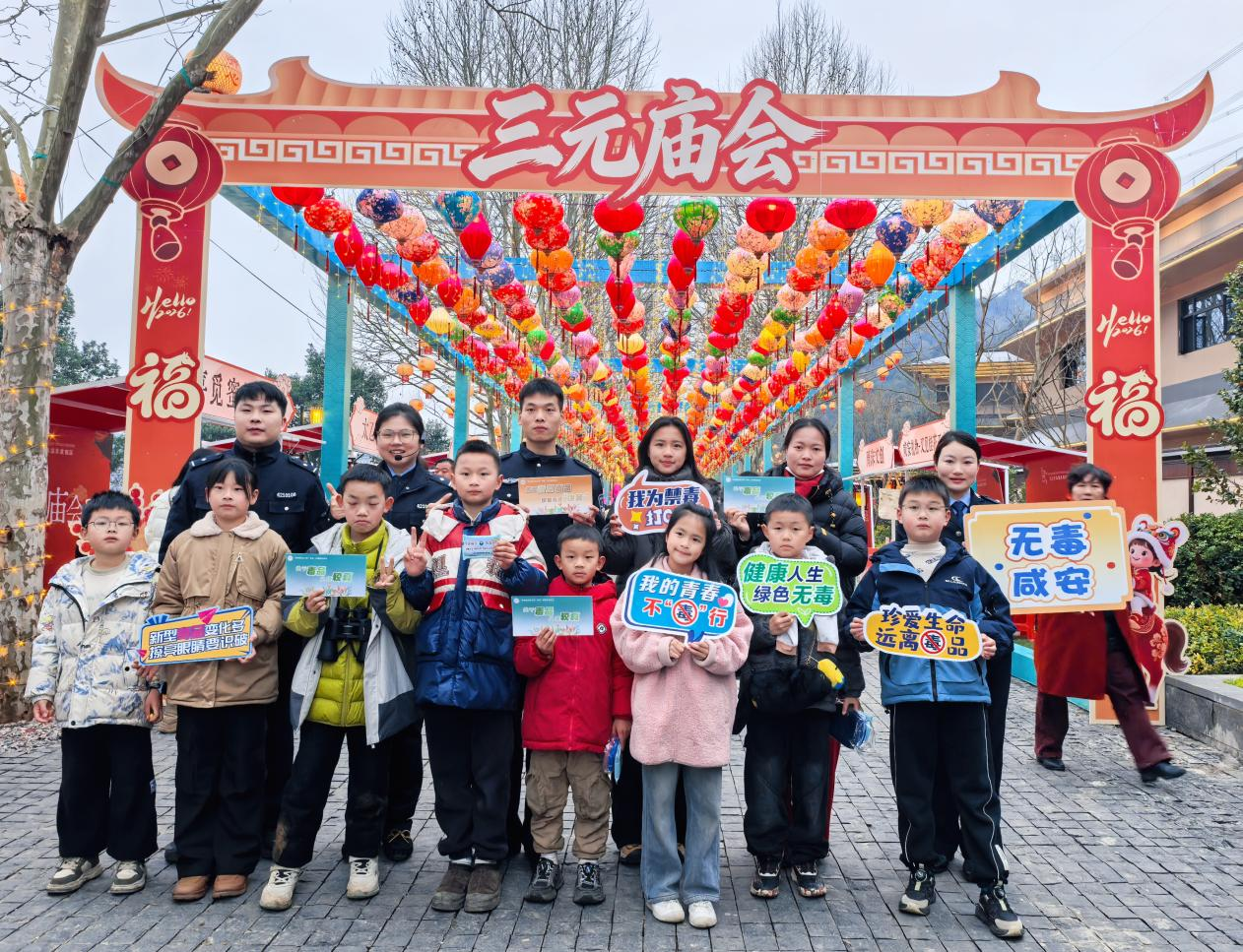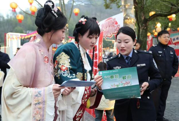 文旅融合倡禁毒,民俗巡游传理念。踩莲船摇曳生姿,戏蚌壳憨态可掬,金丝龙威风凛凛,打铁花璀璨夺目……庙会现场,各类经典民俗展演轮番上演,锣鼓喧天、高潮迭起,将节日氛围拉满。在热闹的“祈福巡游”方阵之中,一支特殊队伍格外亮眼——民警与禁毒社工一起化身“禁毒使者”,与冯京、钱六姐、夜光版财神爷等古装扮演者相向而行,沿途向群众发放禁毒宣传资料和《桂泉文化通俗读本》,一边讲述“三魁天下儒”冯京、才女钱六姐的咸宁历史名人典故,一边传递拒毒防毒的核心理念,让历史人物成为鲜活的“拒毒代言人”。民警还与游客携手“环火共舞”,一同放飞写有“远离毒品,珍爱生命”“无毒家庭,幸福长久”的电子孔明灯,把禁毒祈福的美好心愿化作点点星光,飘向夜空。“既看了热闹饱了眼福,又学到了禁毒知识,这样的活动太有意义了!”市民张先生的感慨,道出了现场群众的共同心声。