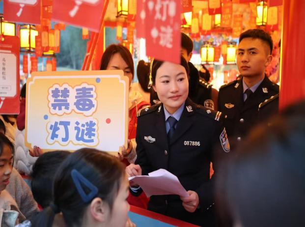 灯谜竞猜学禁毒,寓教于乐润心田。“白色粉末藏祸心,吸上一口难脱身!”庙会主会场的“禁毒灯谜长廊”前,市民李女士一眼猜中谜底,接过印有“健康人生,绿色无毒”的文创手袋,笑得合不拢嘴。主办方精心设计120余条融合法治常识、禁毒知识的原创灯谜,将“上头电子烟”“笑气”等新型毒品防范要点巧妙藏于谜面,让禁毒学习变得趣味十足。参与者答对灯谜即可领取禁毒主题笔袋、雨伞等文创礼品,现场群众或凝神思索,或结伴探讨,在欢声笑语的猜谜互动中,让禁毒知识悄然入脑入心,真正实现“玩中学、学中记”。