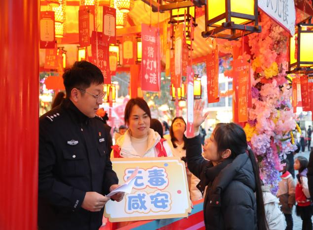 湖北日报讯(通讯员孔祥佳、韦德伟)为深化全民禁毒宣传教育,筑牢平安咸宁禁毒防线,3月2日晚,咸宁市强戒所联合咸安区禁毒办、浮山街道社区戒毒康复中心,走进太乙天沐温泉度假区“三元庙会”现场,将禁毒知识与民俗风情、文旅体验深度融合,为现场群众奉上一场“禁毒+文旅”“禁毒+民俗”的特色文化大餐,让禁毒理念在元宵佳节的热闹氛围中浸润人心。